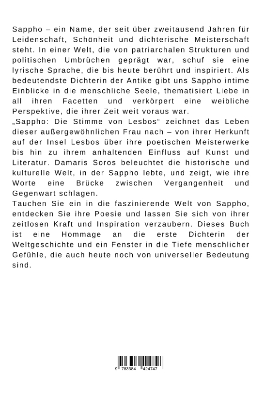 Sappho - ein Name, der seit über zweitausend Jahren für Leidenschaft, Schönheit und dichterische Meisterschaft steht. In einer Welt, die von patriarchalen Strukturen und politischen Umbrüchen geprägt war, schuf sie eine lyrische Sprache, die bis heute berührt und inspiriert. Als bedeutendste Dichterin der Antike gibt uns Sappho intime Einblicke in die menschliche Seele, thematisiert Liebe in all ihren Facetten und verkörpert eine weibliche Perspektive, die ihrer Zeit weit voraus war."Sappho: Die Stimme von Lesbos" zeichnet das Leben dieser außergewöhnlichen Frau nach - von ihrer Herkunft auf der Insel Lesbos über ihre poetischen Meisterwerke bis hin zu ihrem anhaltenden Einfluss auf Kunst und Literatur. Damaris Soros beleuchtet die historische und kulturelle Welt, in der Sappho lebte, und zeigt, wie ihre Worte eine Brücke zwischen Vergangenheit und Gegenwart schlagen.Tauchen Sie ein in die faszinierende Welt von Sappho, entdecken Sie ihre Poesie und lassen Sie sich von ihrer zeitlosen Kraft und Inspiration verzaubern. Dieses Buch ist eine Hommage an die erste Dichterin der Weltgeschichte und ein Fenster in die Tiefe menschlicher Gefühle, die auch heute noch von universeller Bedeutung sind.
