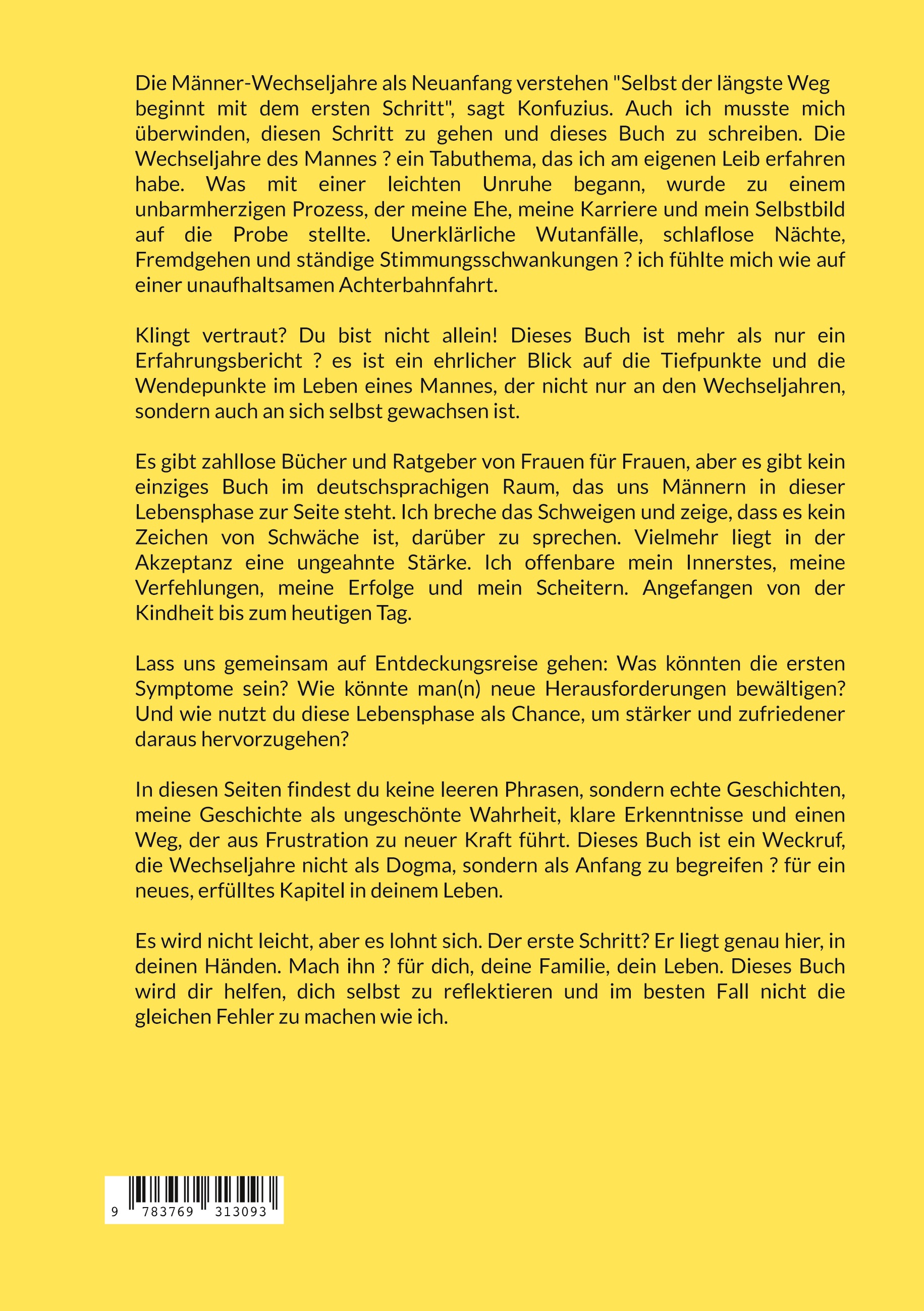 Es gibt zahllose Bücher und Ratgeber von Frauen für Frauen, aber es gibt kein einziges Buch im deutschsprachigen Raum, das uns Männern in dieser Lebensphase zur Seite steht. Ich breche das Schweigen und zeige, dass es kein Zeichen von Schwäche ist, darüber zu sprechen. Vielmehr liegt in der Akzeptanz eine ungeahnte Stärke. Ich offenbare mein Innerstes, meine Verfehlungen, meine Erfolge und mein Scheitern. Angefangen von der Kindheit bis zum heutigen Tag.