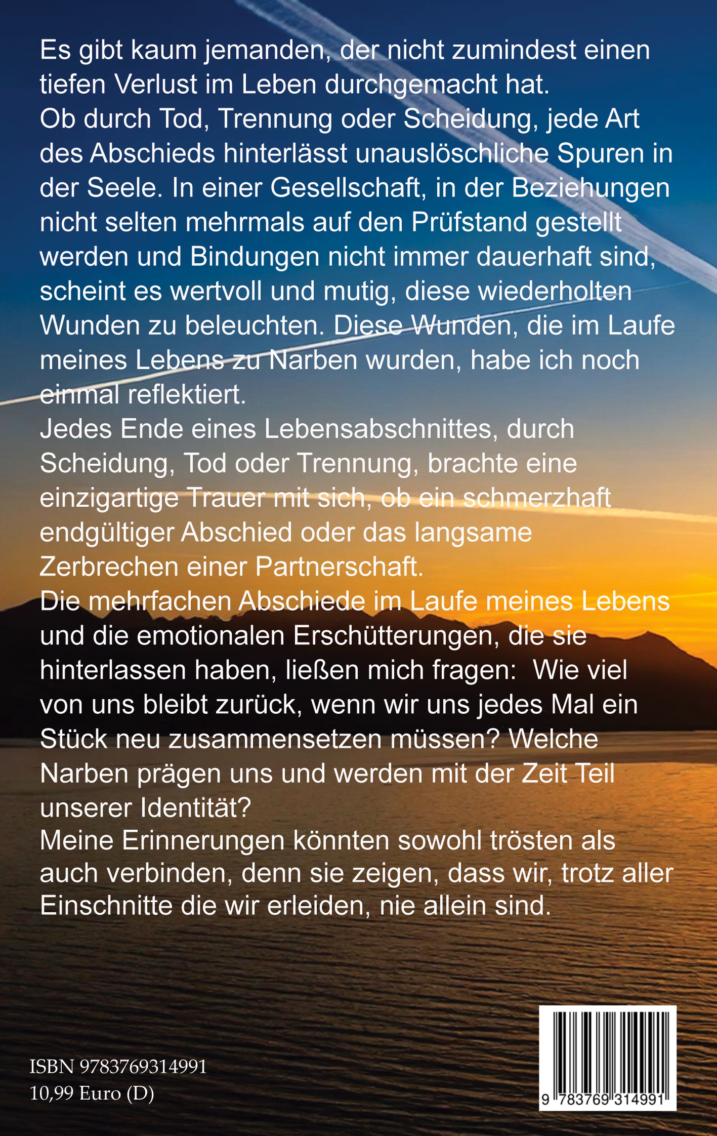 Es gibt kaum jemanden, der nicht zumindest einen tiefen Verlust im Leben durchgemacht hat. Ob durch Tod, Trennung oder Scheidung, jede Art des Abschieds hinterlässt unauslöschliche Spuren in der Seele. In einer Gesellschaft, in der Beziehungen nicht selten mehrmals auf den Prüfstand gestellt werden und Bindungen nicht immer dauerhaft sind, scheint es wertvoll und mutig, diese wiederholten Wunden zu beleuchten. Diese Wunden, die im Laufe meines Lebens zu Narben wurden, habe ich durch meine Reflexion beleuchtet.