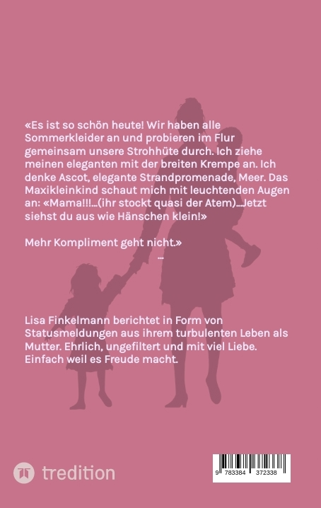 «Es ist so schön heute! Wir haben alle Sommerkleider an und probieren im Flur gemeinsam unsere Strohhüte durch. Ich ziehe meinen eleganten mit der breiten Krempe an. Ich denke Ascot, elegante Strandpromenade, Meer. Das Maxikleinkind schaut mich mit leuchtenden Augen an: «Mama!!!...(ihr stockt quasi der Atem)...Jetzt siehst du aus wie Hänschen klein!»Mehr Kompliment geht nicht.»In kurzen Statusmeldungen berichtet Lisa Finkelmann aus dem turbulenten Alltag als Mutter. Ehrlich, ungefiltert und mit viel Freude teilt sie Situationen, die alle Eltern kennen. Ob sie mit ihrem Maxikleinkind Löcher im Internet verkauft oder das Minikleinkind aus der Spülmaschine angelt - ihr Leben mit Kleinkindern wird definitiv nie langweilig!