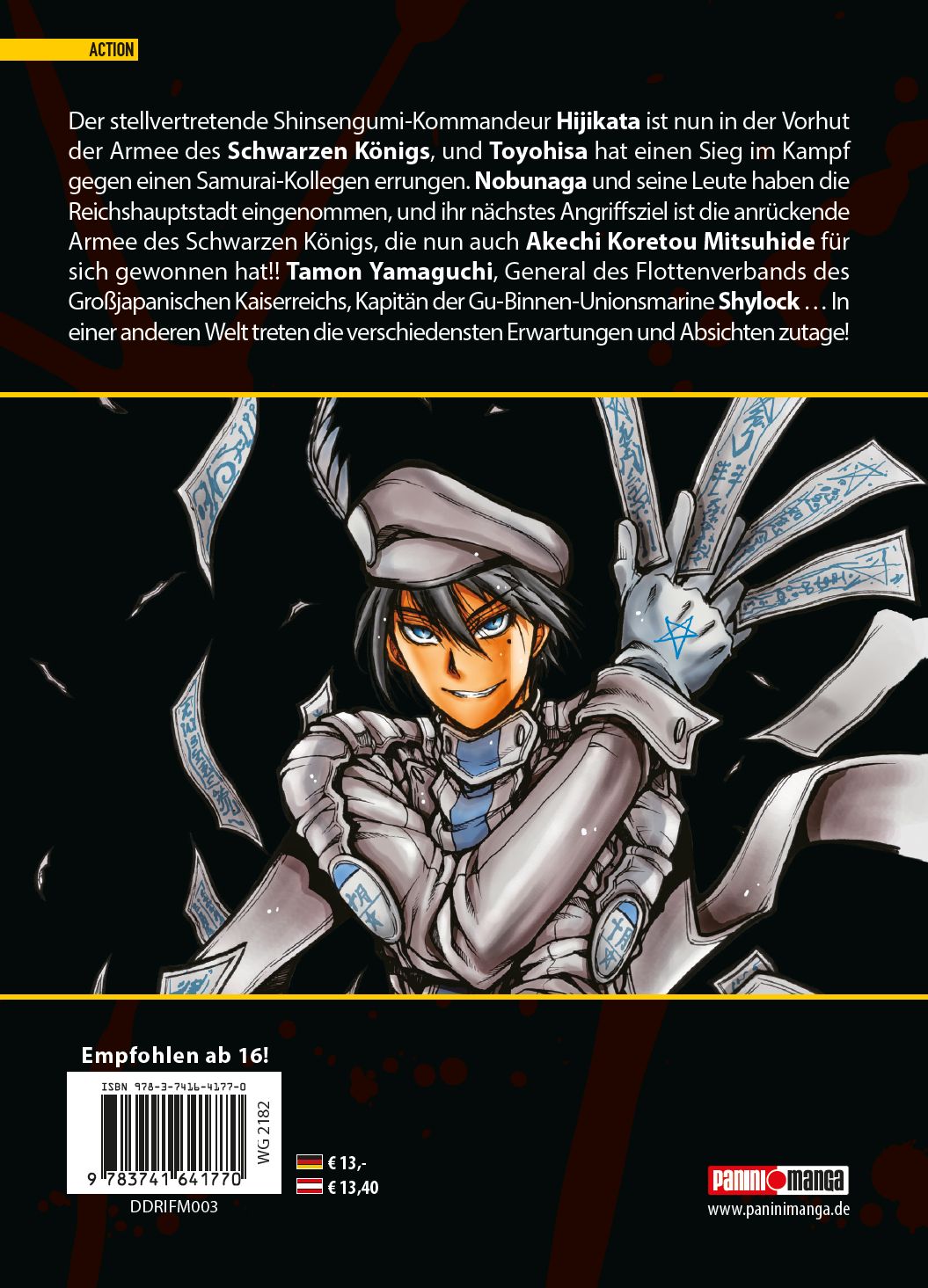 Der stellvertretende Shinsengumi-Kommandeur Hijikata ist nun in der Vorhut der Armee des Schwarzen Königs, und Toyohisa hat einen Sieg im Kampf gegen einen Samurai-Kollegen errungen. Nobunaga und seine Leute haben die Reichshauptstadt eingenommen, und ihr nächstes Angriffsziel ist die anrückende Armee des Schwarzen Königs, die nun auch Akechi Koretou Mitsuhide für sich gewonnen hat!! Tamon Yamaguchi, General des Flottenverbands des Großjapanischen Kaiserreichs, Kapitän der Gu-Binnen-Unionsmarine Shylock … In einer anderen Welt treten die verschiedensten Erwartungen und Absichten zutage!
