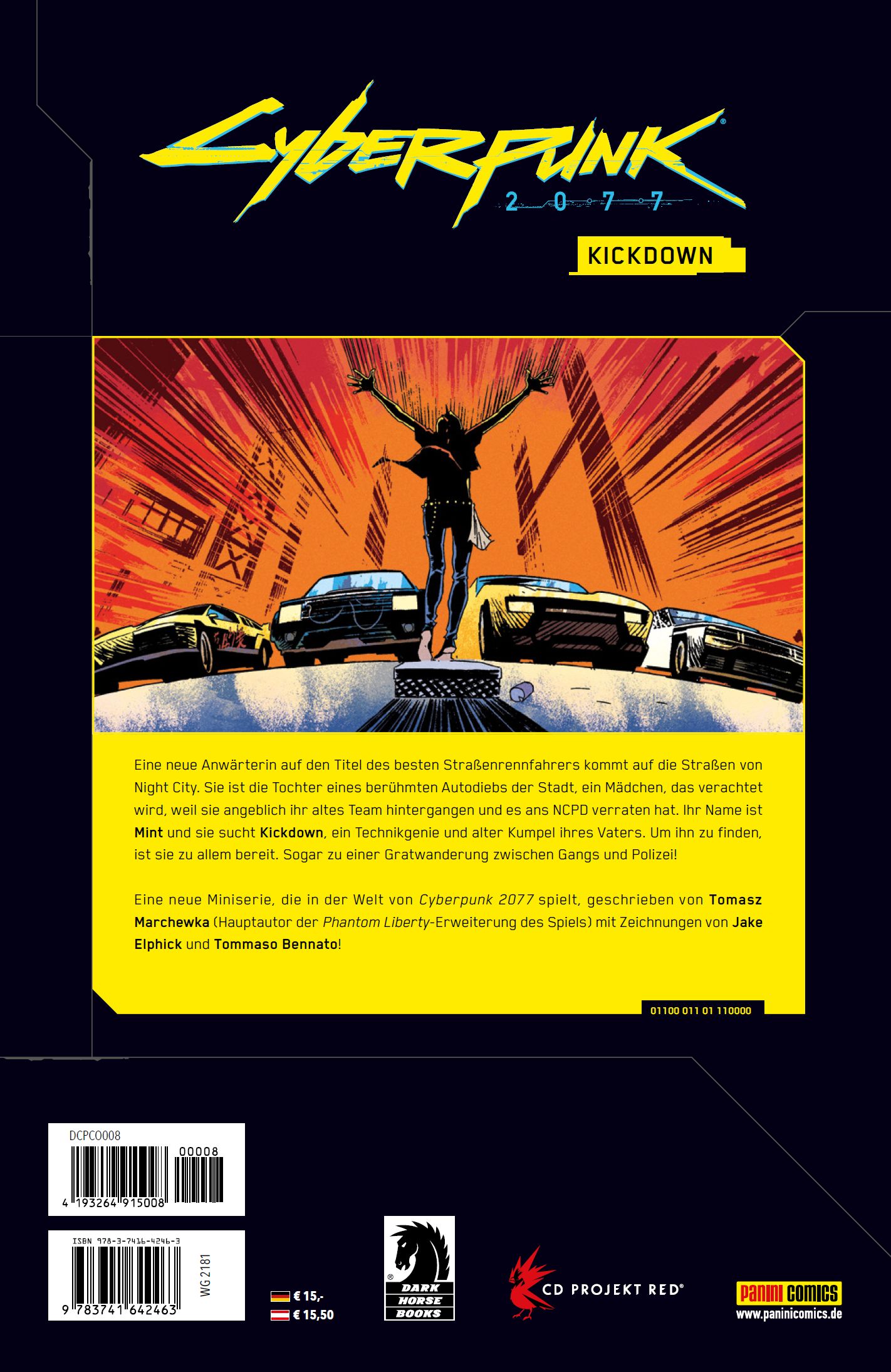 Eine neue Anwärterin auf den Titel des besten Straßenrennfahrers kommt auf die Straßen von Night City. Sie ist die Tochter eines berühmten Autodiebs der Stadt, ein Mädchen, das verachtet wird, weil sie angeblich ihr altes Team hintergangen und es ans NCPD verraten hat. Ihr Name ist Mint und sie sucht Kickdown, ein Technikgenie und alter Kumpel ihres Vaters. Um ihn zu finden, ist sie zu allem bereit. Sogar zu einer Gratwanderung zwischen Gangs und Polizei! Eine neue Miniserie, die in der Welt von Cyberpunk 2077 spielt, geschrieben von Tomasz Marchewka (Hauptautor der Phantom Liberty-Erweiterung des Spiels) mit Zeichnungen von Jake Elphick und Tommaso Bennato!