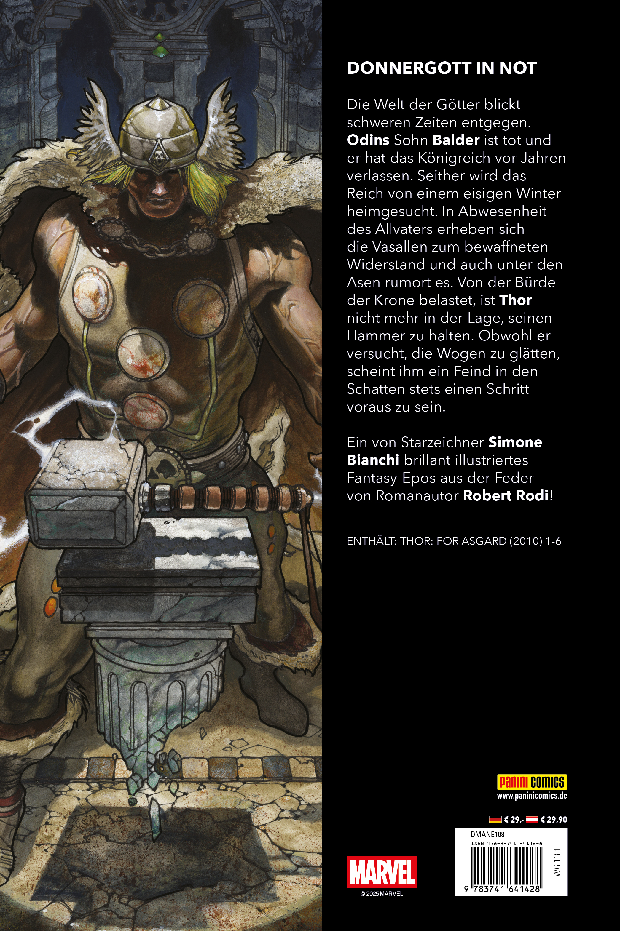 DONNERGOTT IN NOTDie Welt der Götter blickt schweren Zeiten entgegen. Odins Sohn Balder ist tot und er hat das Königreich vor Jahren verlassen. Seither wird das Reich von einem eisigen Winter heimgesucht. In Abwesenheit des Allvaters erheben sich die Vasallen zum bewaffneten Widerstand und auch unter den Asen rumort es. Von der Bürde der Krone belastet, ist Thor nicht mehr in der Lage, seinen Hammer zu halten. Obwohl er versucht, die Wagen zu glätten, scheint ihm ein Feind in den Schatten stets einen Schritt voraus zu sein. Ein von Starzeichner Simone Bianchi brillant illustriertes Fantasy-Epos aus der Feder von Romanautor Robert Rodi! ENTHÄLT: THOR: FOR ASGARD (2010) 1-6