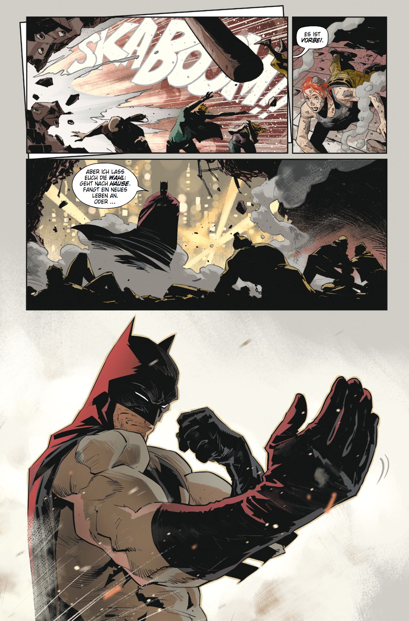 BATMAN GEGEN CATWOMAN Dieser Deluxe-Sammelband enthält das vollständige Crossover Gotham War. Als Batman kämpft Bruce Wayne gegen das Verbrechen in Gotham City, wobei ihn u. a. Dick Grayson alias Nightwing, Damian Wayne alias Robin, Jason Todd alias Red Hood und Barbara Gordon alias Oracle unterstützen. Auch die Meisterdiebin Selina Kyle alias Catwoman zählt eigentlich zu seinen langjährigen Verbündeten, obwohl sich die Beziehung der beiden seit ihrer geplatzten Hochzeit abgekühlt hat. Aktuell wohnt Bruce Wayne nicht mehr auf seinem Landsitz Wayne Manor, sondern direkt in Gotham City – gezwungenermaßen, da der Joker ihm kürzlich sein gesamtes Vermögen abgeknöpft hat. Durch diesen Standortwechsel kann Batman die klassische Bat-Höhle unter Wayne Manor aktuell nicht nutzen und greift jetzt auf unterschiedliche kleine Bat-Höhlen in der Innenstadt zurück. Nach dem Kampf gegen den albtraumhaften Insomnia im Crossover Knight Terrors, worin Deadman den Körper des Dunklen Ritters übernehmen musste, liegt Batman länger als alle anderen Helden in einem komaartigen Tiefschlaf. Und er erwacht in einem Gotham, dessen Unterwelt sich vollkommen verändert hat und jetzt unter Catwomans Führung steht.