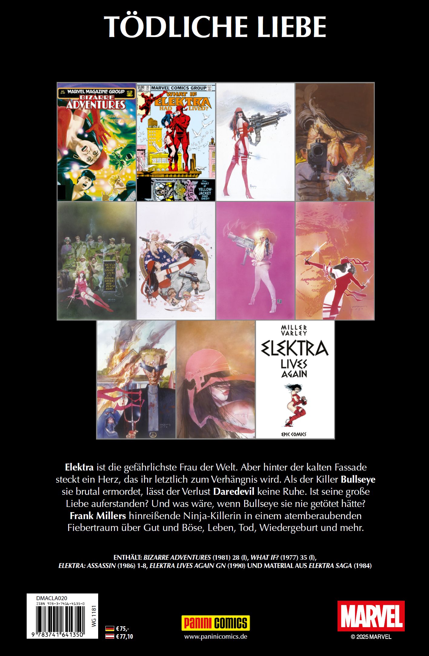 TÖDLICHE LIEBE Elektra ist die gefährlichste Frau der Welt. Aber hinter der kalten Fassade steckt ein Herz, das ihr letztlich zum Verhängnis wird. Als der Killer Bullseye sie brutal ermordet, lässt der Verlust Daredevil keine Ruhe. Ist seine große Liebe auferstanden? Und was wäre, wenn Bullseye sie nie getötet hätte? Frank Millers hinreißende Ninja-Killerin in einem atemberaubenden Fiebertraum über Gut und Böse, Leben, Tod, Wiedergeburt und mehr.ENTHÄLT: BIZARRE ADVENTURES (1981) 28 (I), WHAT IF? (1977) 35 (I), ELEKTRA: ASSASSIN (1986) 1-8, ELEKTRA LIVES AGAIN GN (1990) UND MATERIAL AUS ELEKTRA SAGA (1984)