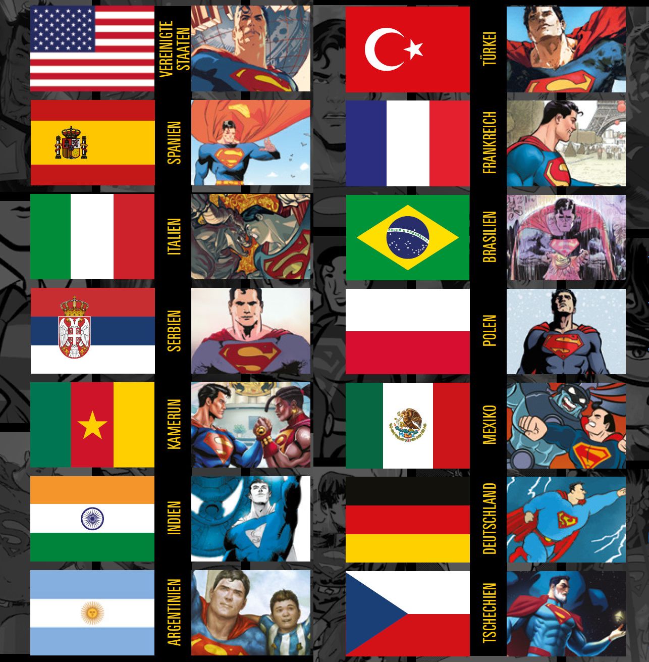 SUPER-GLOBETROTTER Als die Abenteuer von Superman in Deutschland erstmals veröffentlicht wurden, war der Urvater der Superhelden hierzulande noch ein echter Exot. Um die einheimischen Leser schneller an diesen knallbunten Helden zu gewöhnen, verwandelten die deutschen Comic-Macher den amerikanischen Superman in einen echt deutschen Supermann! Sogar seinen bürgerlichen Namen Clark Kent übersetzte man mit Karl Kent und aus Lois Lane wurde kurzerhand Luise Lane. Mittlerweile aber zählt Superman ohne Frage zu den bekanntesten aller Comic-Helden und zu den ikonischsten Figuren der Popkultur weltweit! In quasi jedem Land der Welt kennt man den stählernen Helden, sein S-Symbol und sein rot-blaues Kostüm, und verbindet damit Ideale wie Hoffnung, Gerechtigkeit und Frieden. Begriffe, die auch in Ländern wie Indien, Italien, der Türkei, Serbien oder Kamerun von großer Bedeutung sind. Doch wie würde eine Superman-Geschichte aussehen, wenn man Autoren und Zeichnern aus diesen Ländern Stift und Papier gäbe und ihnen völlig freie Hand bei deren Ausarbeitung ließe ...? Diese Frage beantwortet der hier vorliegende Band, in dem Comic-Macher aus den unterschiedlichsten Nationen ihre ganz eigene Interpretation von Superman in Verbindung mit ihrer Heimat erdacht haben. Ein buntes Panoptikum an packenden, bewegenden und inspirierenden Storys, die so vielfältig und unterschiedlich sind wie die Länder, in denen sie entstanden sind, erwartet hier den Leser. Für die USA, das Heimatland des Stählernen, hat das bekannte Autoren- und Künstlerduo Dan Jurgens und Lee Weeks eine Geschichte verfasst. Für Deutschland hat der beliebte Cartoonist Flix eine Story umgesetzt, die den Helden aus Metropolis ins Nachkriegsdeutschland versetzt. Doch auch die Expeditionen Kal-Els in altindische Tempel, den brasilianischen Regenwald oder die argentinische Metropole Buenos Aires bieten bestes Lesevergnügen. So wie der Mann aus Stahl ein Held für Jedermann ist, so finden sich in dieser Sammlung Geschichten für Jedermann - wir wünschen viel Spaß bei der Lektüre!