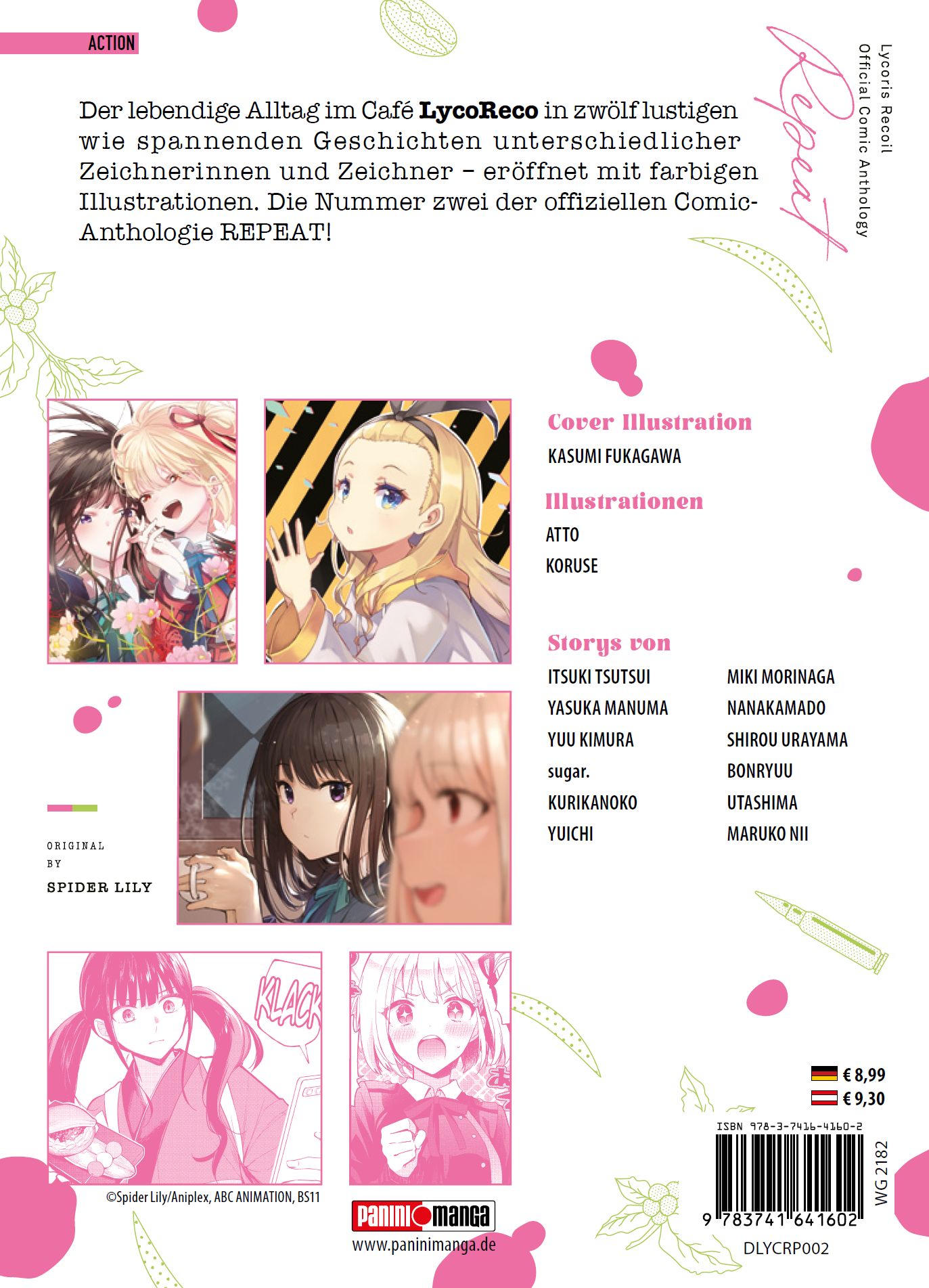 Das Spin-off zur gefeierten Serie! Japan - ein Land, in dem Gewaltverbrechen praktisch nicht existieren. Dafür sorgen, getarnt als Schulmädchen, die Agentinnen von Lycoris, einer eigens zur Prävention von Kriminalität aufgestellten Truppe. Als die wenig zimperliche Takina sich einen groben Patzer bei einem Einsatz leistet, wird sie ins vermeintliche Café LycoReco strafversetzt. In diesem geheimen Stützpunkt von Lycoris ist sie zur Zusammenarbeit mit Chisato verdonnert, die aufgrund ihrer lebensschützenden Maßnahmen so ziemlich das Gegenteil von ihr darstellt. Fortan rücken die Mädels dem Bösen zu Leibe und sparen dabei nicht mit flotten Sprüchen und coolen Tricks. Das erwartet dich in Band 2: Der lebendige Alltag im Café LycoReco in zwölf lustigen wie spannenden Geschichten unterschiedlicher Zeichnerinnen und Zeichner - eröffnet mit farbigen Illustrationen. Die Nummer zwei der offiffiziellen Comic-Anthologie REPEAT!Für Fans von toughen Mädchen, cooler Action und spannenden Abenteuern!