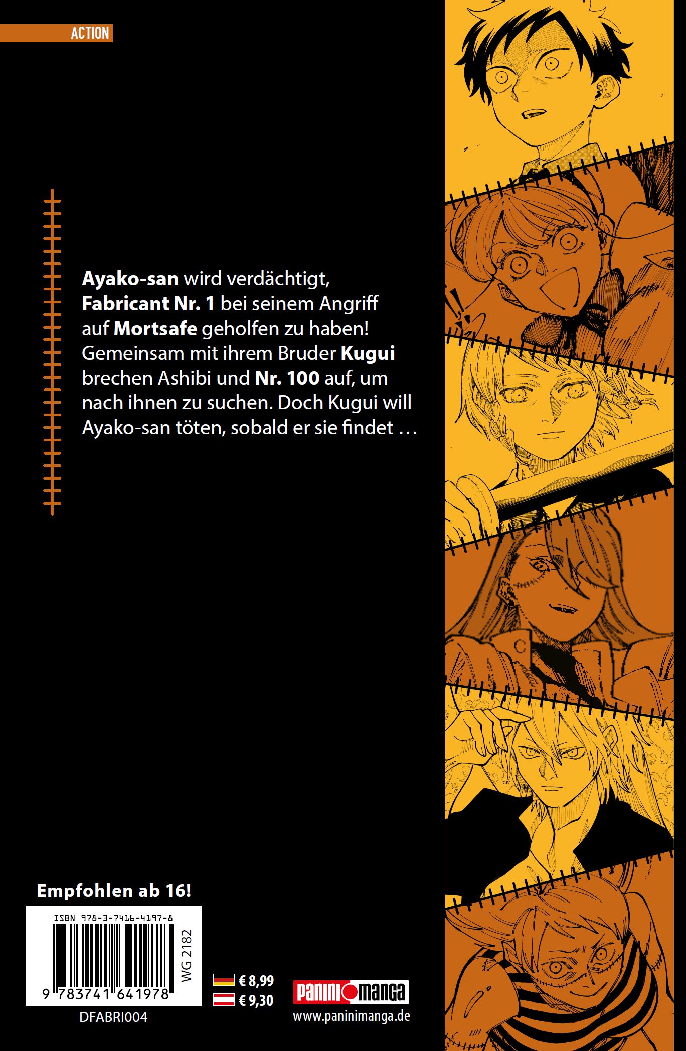 Es war einmal ein Arzt, der darauf fixiert war, den "idealen Menschen" zu erschaffen. Nach dem Tod des Arztes beginnen seine Fabricant-Kreationen, Menschen anzugreifen, um den perfekten Körper zu erlangen. Als Ashibi Yaos gesamte Familie von diesen Fabricants ermordet wird, begibt er sich auf einen Rachefeldzug, begleitet von der letzten Schöpfung des Doktors: Fabricant 100.Das erwartet dich in Band 4: Ayako-san wird verdächtigt, Fabricant Nr. 1 bei seinem Angriff auf Mortsafe geholfen zu haben! Gemeinsam mit ihrem Bruder Kugui brechen Ashibi und Nr. 100 auf, um nach ihnen zu suchen. Doch Kugui will Ayako-san töten, sobald er sie findet ...Für Fans von Action-, Abenteuer- und Mysterymanga!