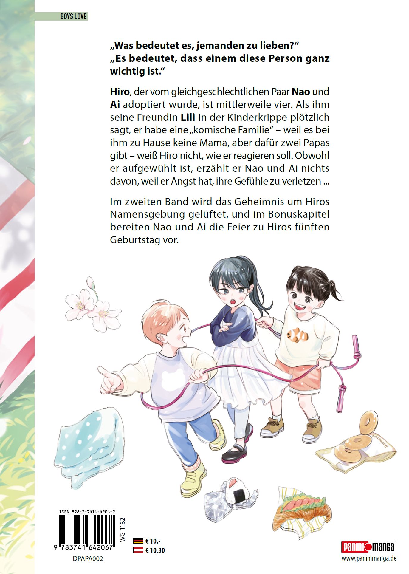 Mein Leben mit Papa und Papa ist ein Manga, der ebenso herzerwärmend wie humorvoll in der Darstellung von Liebe, Familie und Akzeptanz ist.Das erwartet dich in Band 2:"Was bedeutet es, jemanden zu lieben?" "Es bedeutet, dass einem diese Person ganz wichtig ist." Hiro, der vom gleichgeschlechtlichen Paar Nao und Ai adoptiert wurde, ist mittlerweile vier. Als ihm seine Freundin Lili in der Kinderkrippe plötzlich sagt, er habe eine "komische Familie" - weil es bei ihm zu Hause keine Mama, aber dafür zwei Papas gibt - weiß Hiro nicht, wie er reagieren soll. Obwohl er aufgewühlt ist, erzählt er Nao und Ai nichts davon, weil er Angst hat, ihre Gefühle zu verletzen ... Im zweiten Band wird das Geheimnis um Hiros Namensgebung gelüftet, und im Bonuskapitel bereiten Nao und Ai die Feier zu Hiros fünften Geburtstag vor.Für alle Fans von BL-, Slice-of-Life- und Comedy-Manga.
