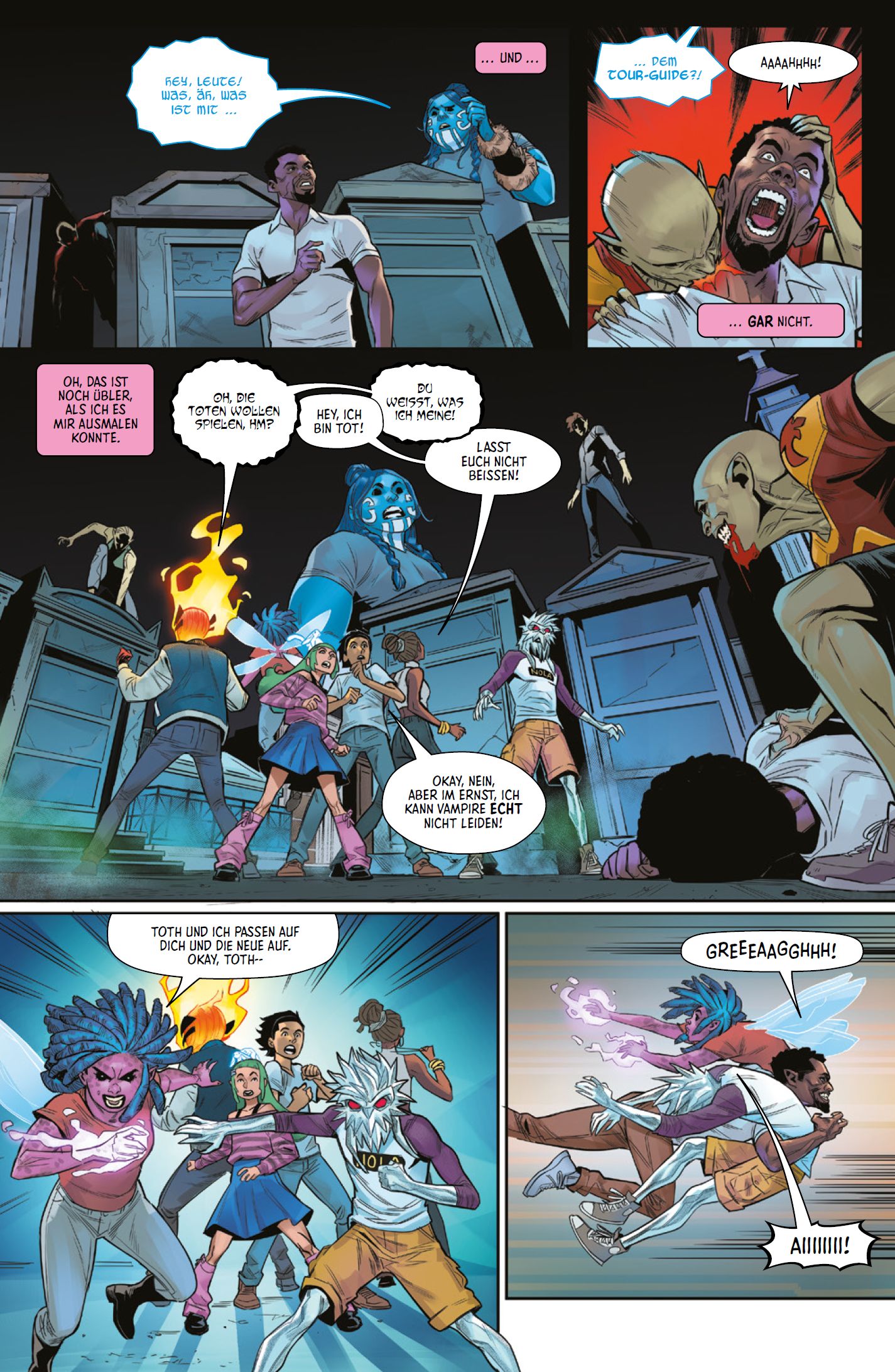 VORWORT von Christian EndresVor einigen Jahren gründete Dr. Stephen Strange die Strange Academy: einen Ort, an dem übernatürlich begabte Jugendliche aus allen bekannten Welten magisch ausgebildet werden können, unterrichtet von Rektor Dr. Voodoo Jericho Drumm oder Lehrerinnen wie Wanda Maximoff und Agatha Harkness. Zu den Schülern zählen zum Beispiel Dormammus Sohn Doyle, Feentochter Shaylee, Gus aus dem Volk der Frostriesen, Kristallkriegersohn Toth aus Weirdworld, Germán mit seinen astralen Tierprojektionen und Zombiemädchen Zoe. Ihr ohnehin unberechenbarer Schulalltag wird in diesem Band jetzt durch das Crossover- Event Blood Hunt noch mehr durcheinandergewirbelt. Denn die Vampire haben die Menschenwelt mithilfe von Energie aus der Darkforce-Dimension in ewige Finsternis gestürzt. Die Avengers wurden indes durch den Verrat von ausgerechnet Obervampirjäger Blade hart getroffen. Der Daywalker hat sogar Dr. Strange mit dem Schwert durchbohrt und dauerhaft in seine Astralform gezwungen. Die Welt wird nun von Vampir-Horden überrannt. Das hat auch schon Brielle Brooks alias Bloodline zu spüren bekommen, die Tochter von Blade, die derzeit in Atlanta lebt und zu Beginn von Blood Hunt unerwartet von Dracula gerettet worden war, eigentlich der Erzfeind ihres Vaters und König der noch recht jungen Vampirnation in Tschernobyl. Wie es dazu gekommen war, dass Dracula sich auf Brielles Seite gegen die Vampire stellte, und wie es mit den beiden weitergeht, enthüllt dieser Band. Noch ein paar Worte zur Lesereihenfolge: Die Geschichte mit Brielle und Dracula setzt sogar noch vor dem ersten Heft der Miniserie Blood Hunt ein, die nachfolgenden Kapitel über sie wiederum zwischen den beiden Kapiteln im finalen Event-Heft. Wichtig, und hier folgt nun ein Spoiler für Blood Hunt 3: Dort wird gleich zu Beginn enthüllt, dass Blade nicht eigenständig handelt, sondern vom ersten aller Vampire Varnae kontrolliert wird. Die Jagd der Kids von der Strange Academy nach dem mächtigen Darkhold-Zauberbuch findet indes komplett vor dem dritten Event-Heft statt ...