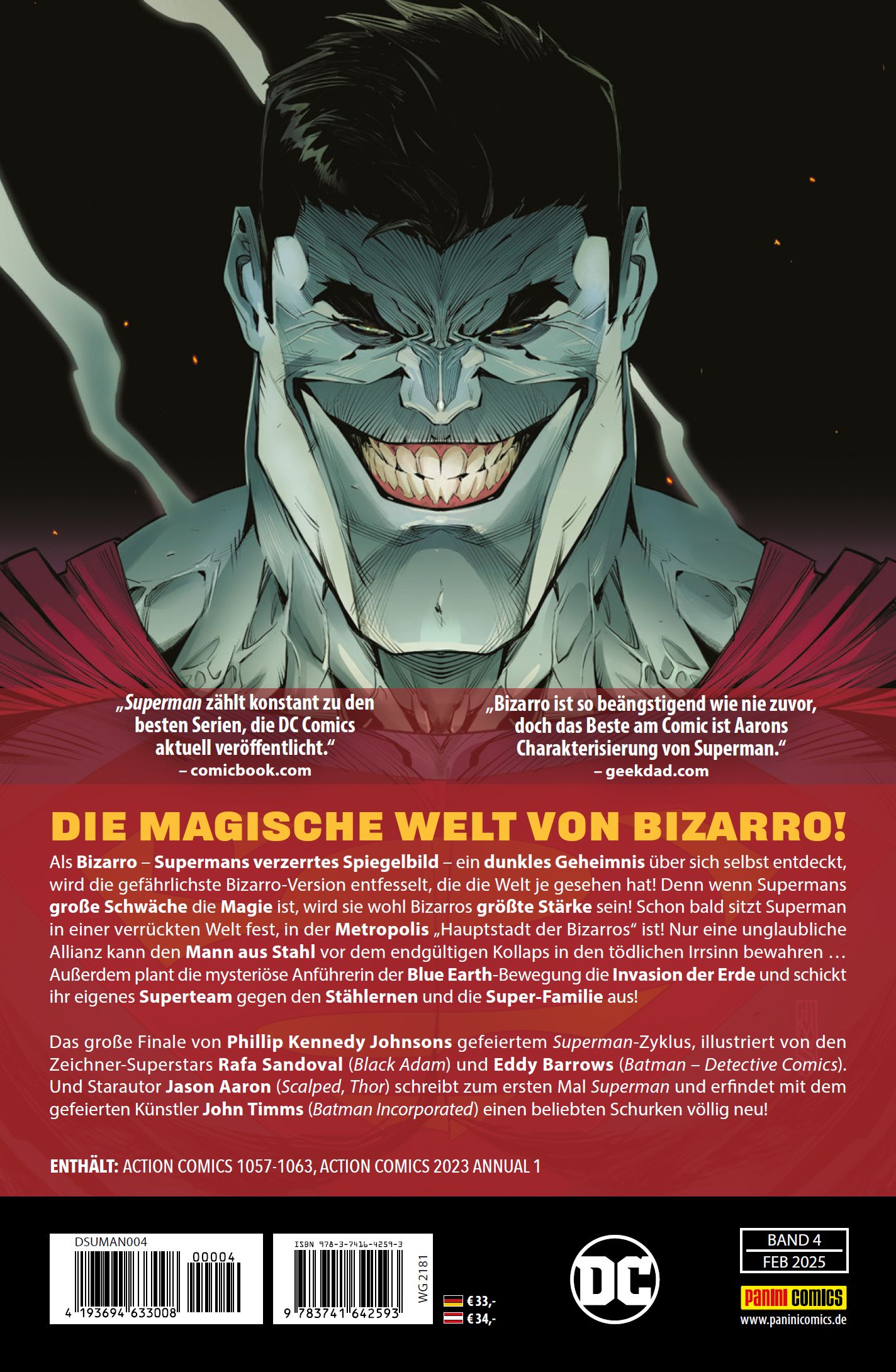 DIE MAGISCHE WELT VON BIZARRO! Als Bizarro - Supermans verzerrtes Spiegelbild - ein dunkles Geheimnis über sich selbst entdeckt, wird die gefährlichste Bizarro-Version entfesselt, die die Welt je gesehen hat! Denn wenn Supermans große Schwäche die Magie ist, wird sie wohl Bizarros größte Stärke sein! Schon bald sitzt Superman in einer verrückten Welt fest, in der Metropolis Hauptstadt der Bizarros ist! Nur eine unglaubliche Allianz kann den Mann aus Stahl vor dem endgültigen Kollaps in den tödlichen Irrsinn bewahren ... Außerdem plant die mysteriöse Anführerin der Blue Earth-Bewegung die Invasion der Erde und schickt ihr eigenes Superteam gegen den Stählernen und die Super-Familie aus! Das große Finale von Phillip Kennedy Johnsons gefeiertem Superman-Zyklus, illustriert von den Zeichner-Superstars Rafa Sandoval (Black Adam) und Eddy Barrows (Batman - Detective Comics). Und Starautor Jason Aaron (Scalped, Thor) schreibt zum ersten Mal Superman und erfindet mit dem gefeierten Künstler John Timms (Batman Incorporated) einen beliebten Schurken völlig neu!ENTHÄLT: ACTION COMICS 1057-1063, ACTION COMICS 2023 ANNUAL 1