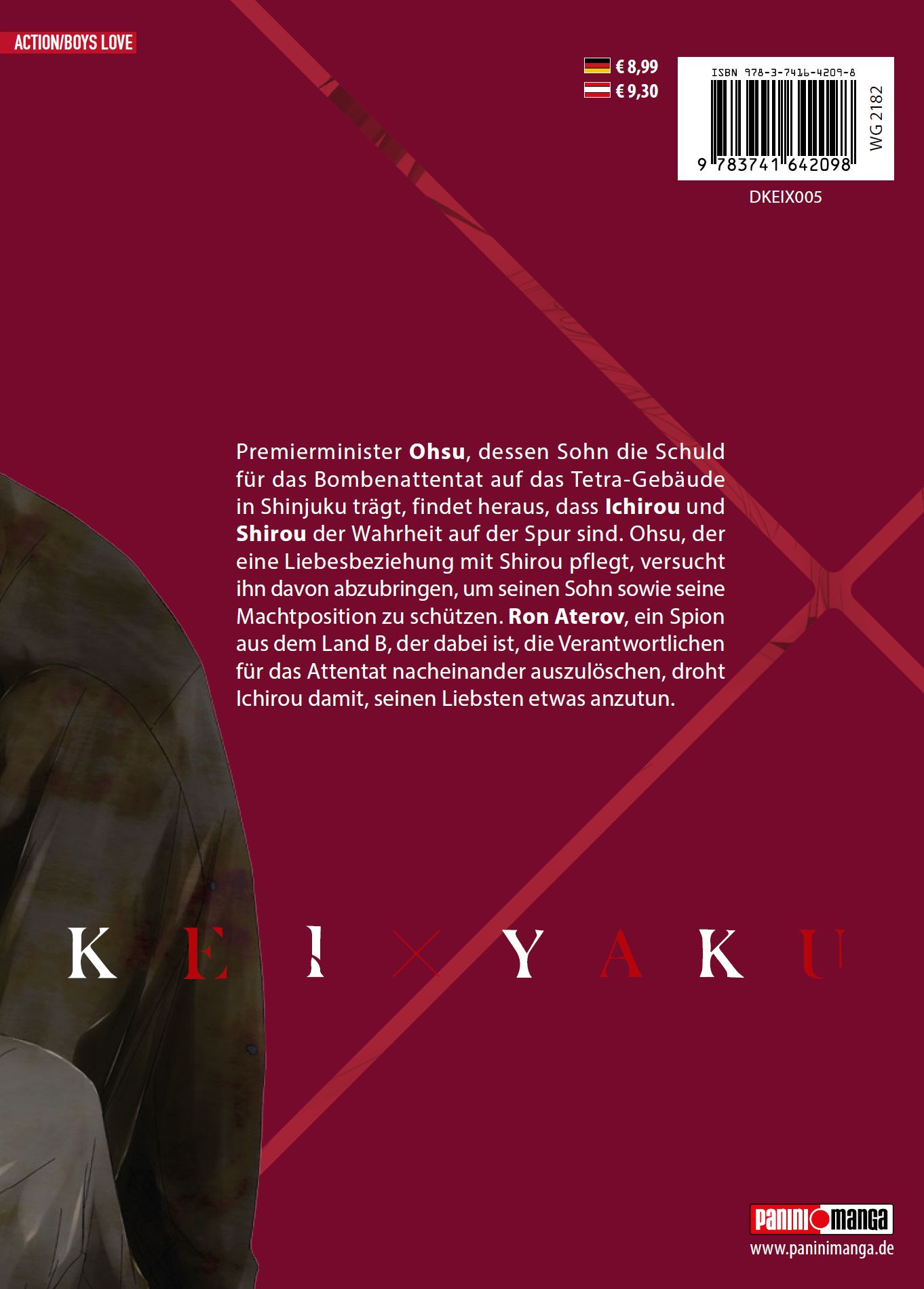 Kei x Yaku erzählt die spannende Geschichte eines Polizisten und eines Yakuza-Mitglieds, die gezwungen sind, zusammenzuarbeiten, um eine gefährliche Verschwörung aufzudecken. Während sie ihre Differenzen überwinden, entwickeln sie eine unerwartete Bindung ... Erlebe die packende Dynamik und die tiefgründigen Charaktere in diesem fesselnden Manga!Das erwartet dich in Band 5: Premierminister Ohsu, dessen Sohn die Schuld für das Bombenattentat auf das Tetra-Gebäude in Shinjuku trägt, findet heraus, dass Ichirou und Shirou der Wahrheit auf der Spur sind. Ohsu, der eine Liebesbeziehung mit Shirou pflegt, versucht ihn davon abzubringen, um seinen Sohn sowie seine Machtposition zu schützen. Ron Aterov, ein Spion aus dem Land B, der dabei ist, die Verantwortlichen für das Attentat nacheinander auszulöschen, droht Ichirou damit, seinen Liebsten etwas anzutun.Für Fans von Action-, Krimi-, Mystery- und Boys-Love-Manga!