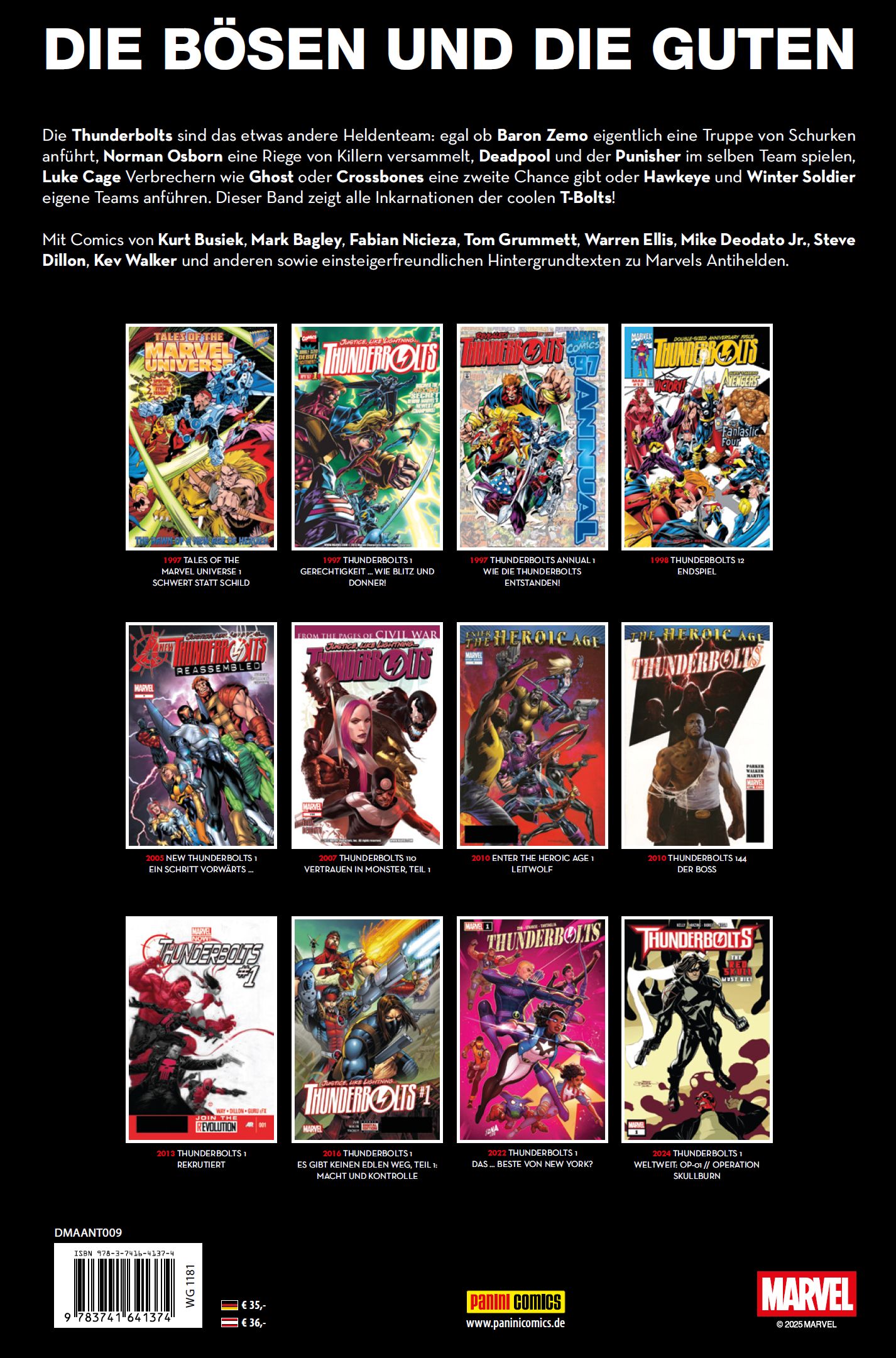DIE BÖSEN UND DIE GUTEN Die Thunderbolts sind das etwas andere Heldenteam: egal ob Baron Zemo eigentlich eine Truppe von Schurken anführt, Norman Osborn eine Riege von Killern versammelt, Deadpool und der Punisher im selben Team spielen, Luke Cage Verbrechern wie Ghost oder Crossbones eine zweite Chance gibt oder Hawkeye und Winter Soldier eigene Teams anführen. Dieser Band zeigt alle Inkarnationen der coolen T-Bolts! Mit Comics von Kurt Busiek, Mark Bagley, Fabian Nicieza, Tom Grummett, Warren Ellis, Mike Deodato Jr., Steve Dillon, Kev Walker und anderen sowie einsteigerfreundlichen Hintergrundtexten zu Marvels Antihelden.
