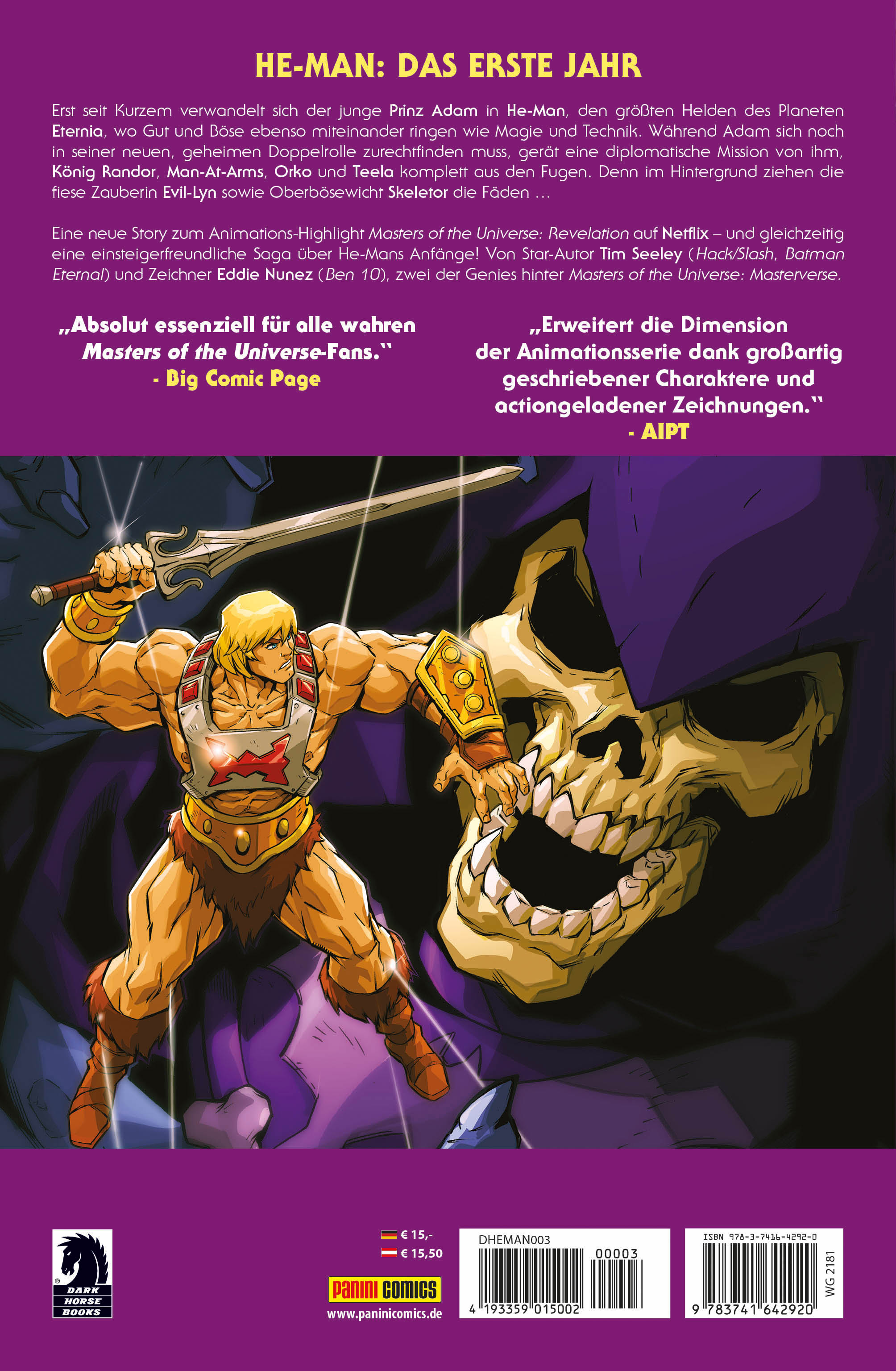 HE-MAN: DAS ERSTE JAHR Erst seit Kurzem verwandelt sich der junge Prinz Adam in He-Man, den größten Helden des Planeten Eternia, wo Gut und Böse ebenso miteinander ringen wie Magie und Technik. Während Adam sich noch in seiner neuen, geheimen Doppelrolle zurechtfinden muss, gerät eine diplomatische Mission von ihm, König Randor, Man-At-Arms, Orko und Teela komplett aus den Fugen. Denn im Hintergrund ziehen die fiese Zauberin Evil-Lyn sowie Oberbösewicht Skeletor die Fäden ... Eine neue Story zum Animations-Highlight Masters of the Universe: Revelation auf Netflix - und gleichzeitig eine einsteigerfreundliche Saga über He-Mans Anfänge! Von Star-Autor Tim Seeley (Hack/Slash, Batman Eternal) und Zeichner Eddie Nunez (Ben 10), zwei der Genies hinter Masters of the Universe: Masterverse.