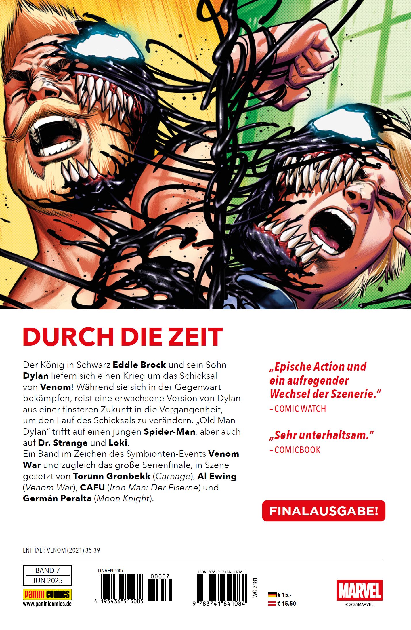 DURCH DIE ZEIT Der König in Schwarz Eddie Brock und sein Sohn Dylan liefern sich einen Krieg um das Schicksal von Venom! Während sie sich in der Gegenwart bekämpfen, reist eine erwachsene Version von Dylan aus einer finsteren Zukunft in die Vergangenheit, um den Lauf des Schicksals zu verändern. "Old Man Dylan" trifft auf einen jungen Spider-Man, aber auch auf Dr. Strange und Loki. Ein Band im Zeichen des Symbionten-Events Venom War und zugleich das große Serienfinale, in Szene gesetzt von Torunn Grønbekk (Carnage), Al Ewing (Venom War), CAFU (Iron Man: Der Eiserne) und Germán Peralta (Moon Knight).ENTHÄLT: VENOM (2021) 35-39FINALAUSGABE!