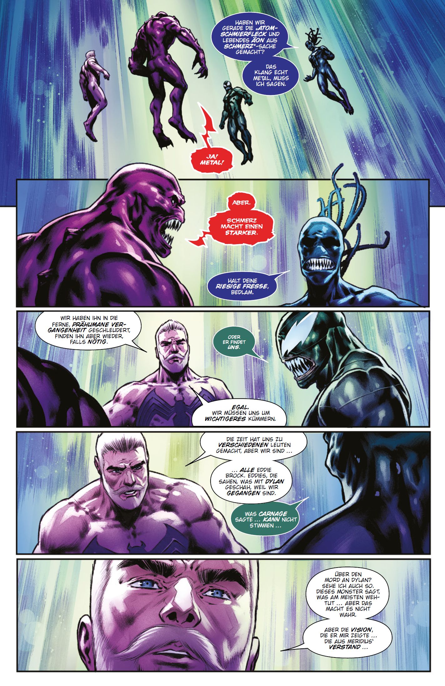 VOROWORT von Christian EndresDieser Comic ist Teil des Symbionten-Crossovers Venom War, das noch aus einer dreiteiligen Event-Hauptserie sowie zwei Event-Sonderbänden besteht. Da es gleich um eine Zeitreise geht, fangen wir hier ebenfalls mit einer an. Denn vor vielen Jahren brachte Spider-Man etwas aus dem All mit auf die Erde, das er für ein intelligentes Kostüm hielt. In Wahrheit war das "Alien-Kostüm" aber ein Symbiont vom Volk der Klyntar. Nach Spidey tat sich das Alien mit dem in Ungnade gefallenen, hasserfüllten Reporter Eddie Brock zusammen: Die beiden wurden zum Superschurken Venom und avancierten später zum Antihelden. Schließlich musste Eddie die Erde vor Knull retten, dem Gott der Klyntar. Außerdem erfuhr Eddie, dessen Ehefrau Anne schon lange tot ist, dass er einen Sohn namens Dylan hat. Eddie besiegte Knull und wurde der neue König in Schwarz, der Herrscher der Symbionten. Als solcher erlebte er einige krasse Abenteuer zwischen Raum und Zeit und landete im Garten am Ende der Existenz, wo verschiedene Versionen seiner selbst lebten - darunter der durch und durch böse Meridius. In Carnage 2 gelang es Venom- Ableger Carnage, Dylan zu töten, weshalb der von einem Super-Vampir geschwächte Venom-Symbiont nun dahinvegetiert. Zudem gelangte Carnage in die Zukunft und in den Garten, den er zerstörte - woraufhin Eddie und diverse Versionen von ihm durch den Zeitstrom geschleudert wurden. Eddie weiß nicht, dass Dylan, der von den Symbionten Sleeper und Flexo beschützt wird, am Leben ist und einen Blick auf eine finstere Zukunft mit Eddie und Venom erhascht hat. Und an dieser Stelle knüpfen unser Serienfinale sowie das Event Venom War an. Noch ein paar Worte zu dessen Chronologie: Das erste Kapitel dieses Comics setzt noch vor Venom War 1 ein, "Old Man Dylans" Zeitreise findet dann parallel zu den Geschehnissen in Venom War 2 statt, und schließlich ist der alte Dylan im letzten Kapitel von Venom War 3 pünktlich fürs Finale des Crossovers zur Stelle - nach den Ereignissen und Entwicklungen, die ihr nun lesen werdet ...