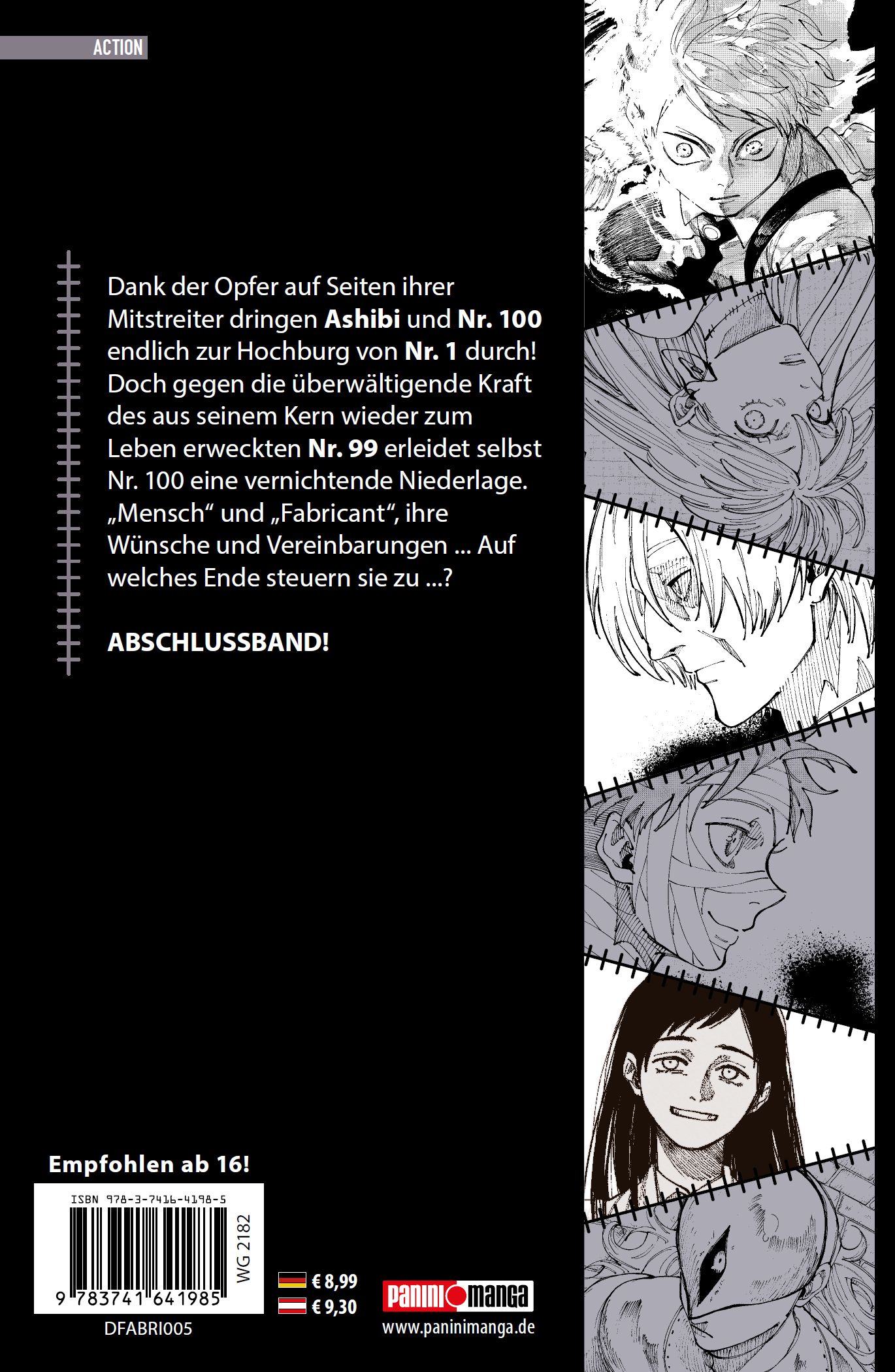 Es war einmal ein Arzt, der darauf fixiert war, den "idealen Menschen" zu erschaffen. Nach dem Tod des Arztes beginnen seine Fabricant-Kreationen, Menschen anzugreifen, um den perfekten Körper zu erlangen. Als Ashibi Yaos gesamte Familie von diesen Fabricants ermordet wird, begibt er sich auf einen Rachefeldzug, begleitet von der letzten Schöpfung des Doktors: Fabricant 100. Das erwartet dich in Band 5: Dank der Opfer auf Seiten ihrer Mitstreiter dringen Ashibi und Nr. 100 endlich zur Hochburg von Nr. 1 durch! Doch gegen die überwältigende Kraft des aus seinem Kern wieder zum Leben erweckten Nr. 99 erleidet selbst Nr. 100 eine vernichtende Niederlage. "Mensch" und "Fabricant", ihre Wünsche und Vereinbarungen ... Auf welches Ende steuern sie zu ...? ABSCHLUSSBAND!Für Fans von Action-, Abenteuer- und Mysterymanga!