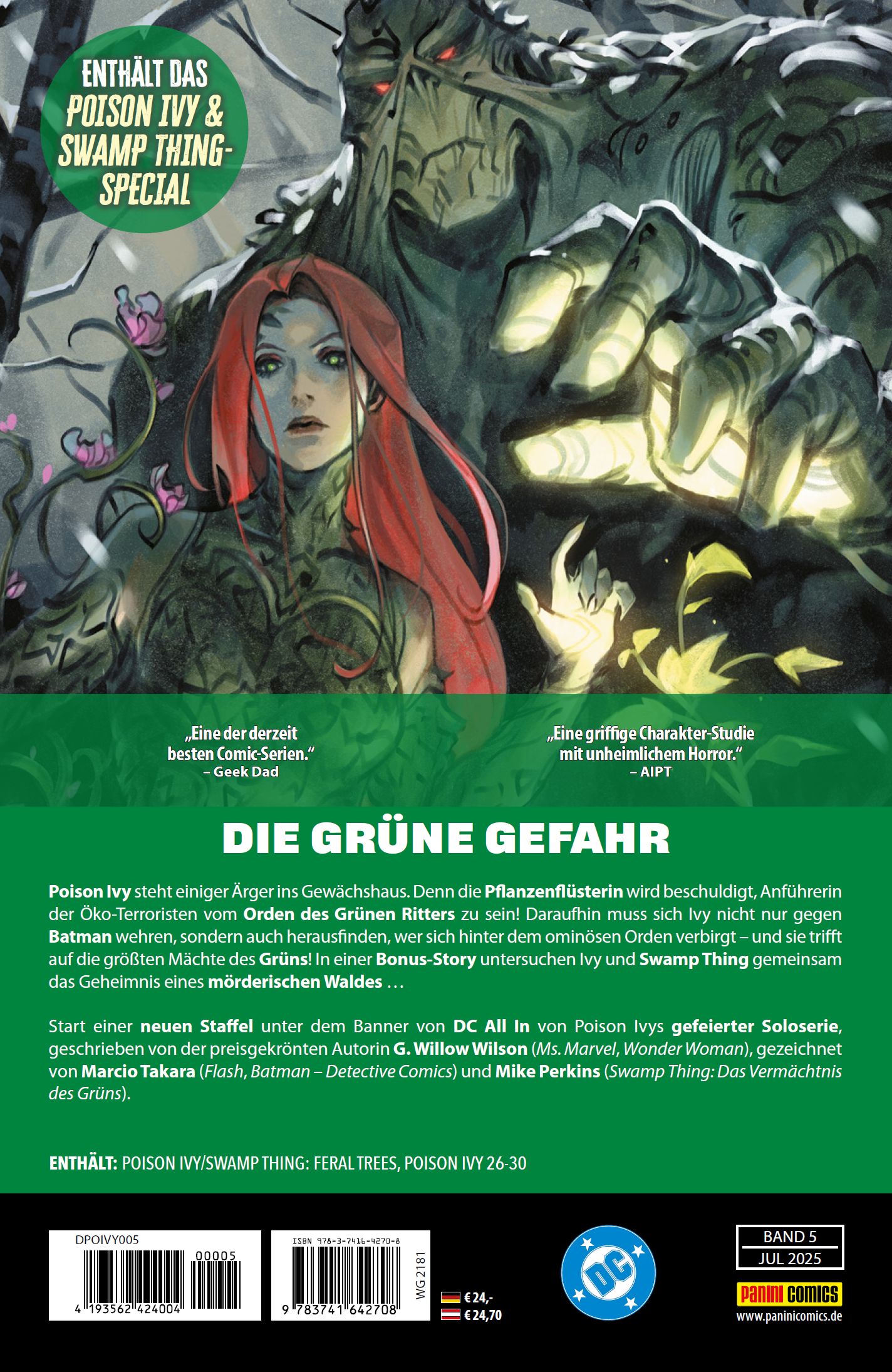 DIE GRÜNE GEFAHRPoison Ivy steht einiger Ärger ins Gewächshaus. Denn die Pflanzenflüsterin wird beschuldigt, Anführerin der Öko-Terroristen vom Orden des Grünen Ritters zu sein! Daraufhin muss sich Ivy nicht nur gegen Batman wehren, sondern auch herausfinden, wer sich hinter dem ominösen Orden verbirgt - und sie trifft auf die größten Mächte des Grüns! In einer Bonus-Story untersuchen Ivy und Swamp Thing gemeinsam das Geheimnis eines mörderischen Waldes ...Start einer neuen Staffel unter dem Banner von DC All In von Poison Ivys gefeierter Soloserie, geschrieben von der preisgekrönten Autorin G. Willow Wilson (Ms. Marvel, Wonder Woman), gezeichnet von Marcio Takara (Flash, Batman - Detective Comics) und Mike Perkins (Swamp Thing: Das Vermächtnis des Grüns).ENTHÄLT: POISON IVY/SWAMP THING: FERAL TREES, POISON IVY 26-30ENTHÄLT DAS POISON IVY & SWAMP THING SPECIAL