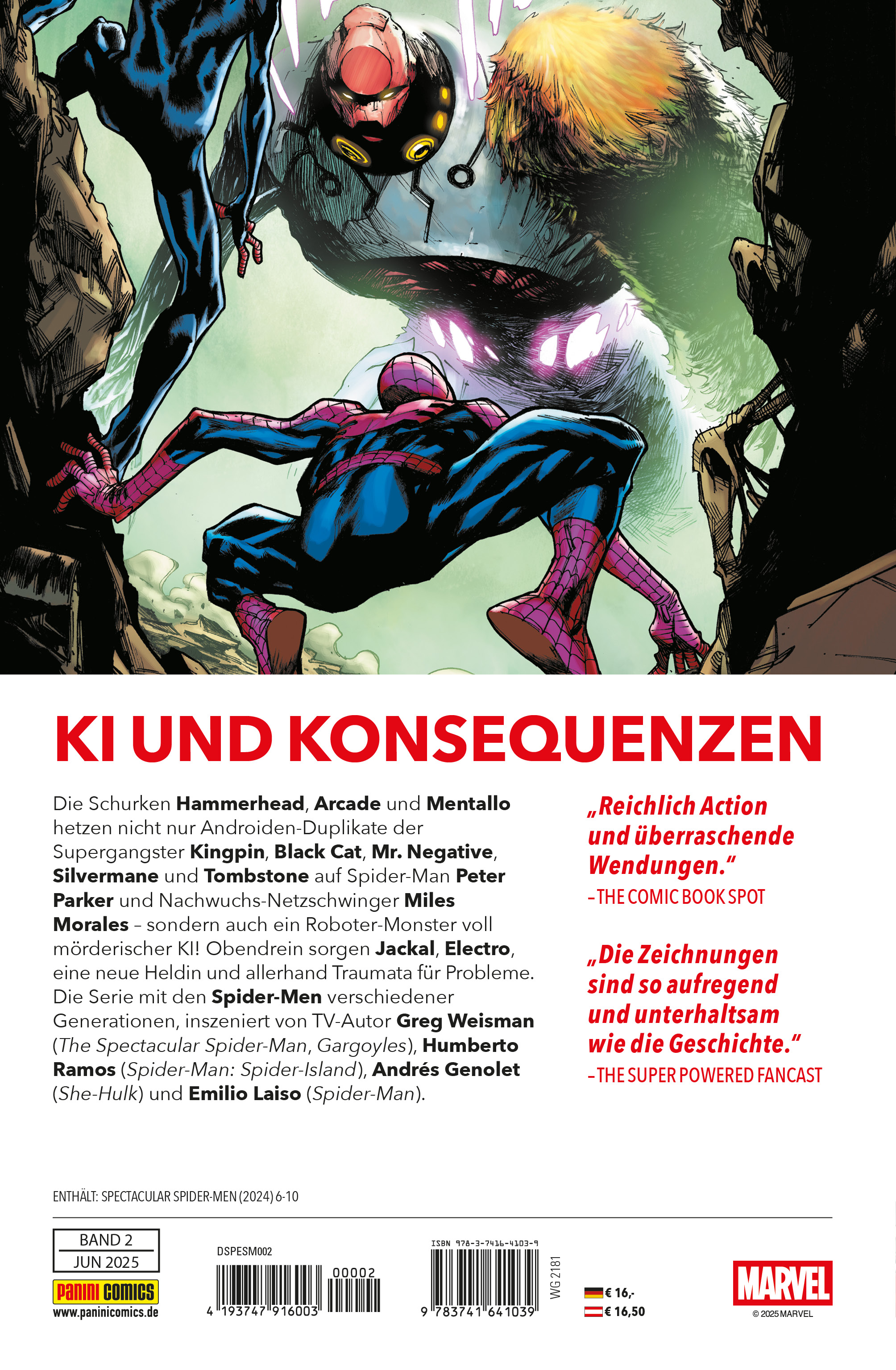 KI UND KONSEQUENZEN Die Schurken Hammerhead, Arcade und Mentallo hetzen nicht nur Androiden-Duplikate der Supergangster Kingpin, Black Cat, Mr. Negative, Silvermane und Tombstone auf Spider-Man Peter Parker und Nachwuchs-Netzschwinger Miles Morales - sondern auch ein Roboter-Monster voll mörderischer KI! Obendrein sorgen Jackal, Electro, eine nue Heldin und allerhand Traumata für Probleme. Die Serie mit den Spider-Men verschiedener Generationen, inszeniert von TV-Autor Greg Weisman (The Spectacular Spider-Man, Gargoyles), Humberto Ramos (Spider-Man: Spider-Island), Andrés Genolet (She-Hulk) und Emilio Laiso (Spider-Man). ENTHÄLT: SPECTACULAR SPIDER-MEN (2024) 6-10