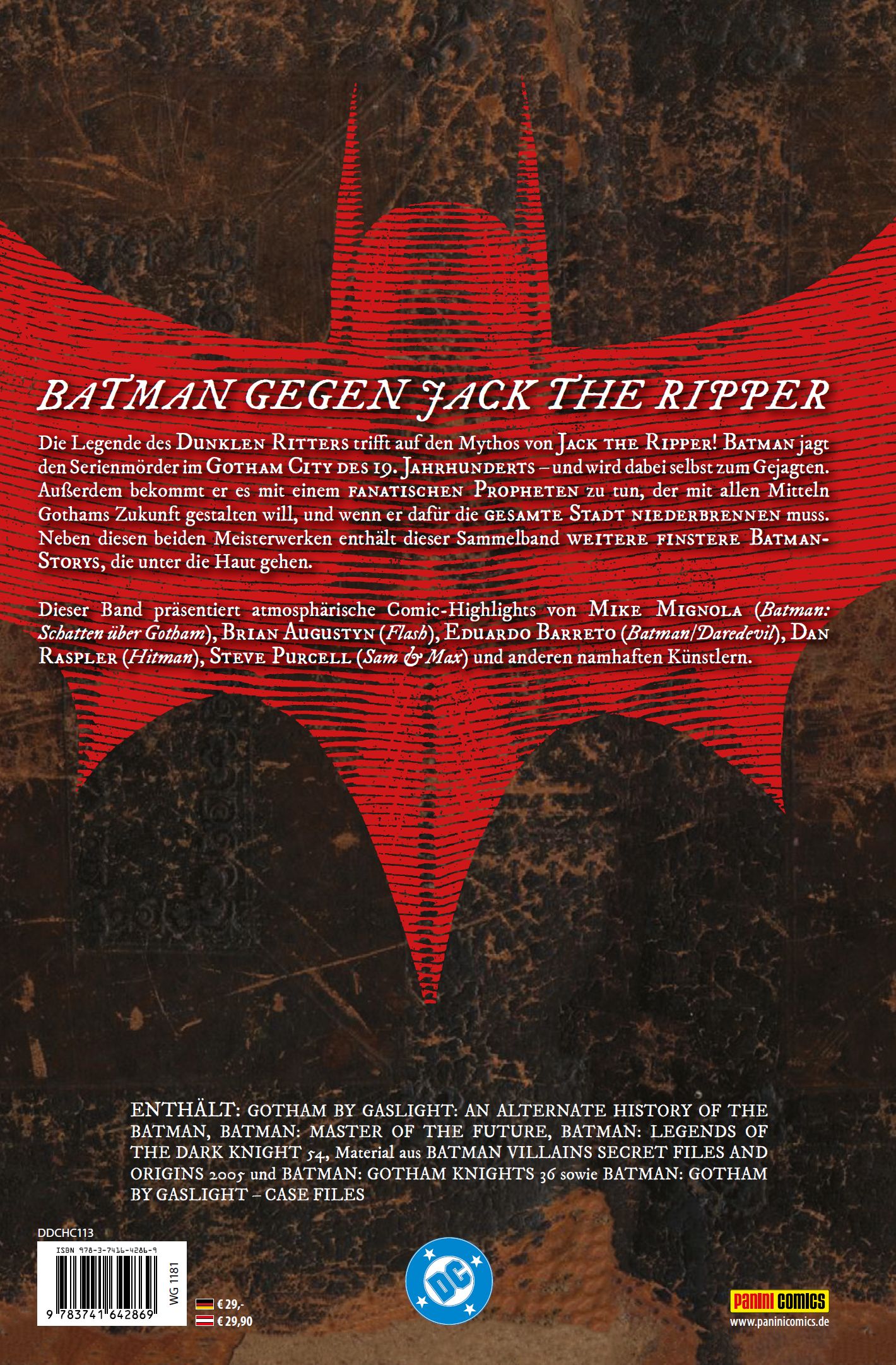 BATMAN GEGEN JACK THE RIPPER Die Legende des Dunklen Ritters trifft auf den Mythos von Jack the Ripper! Batman jagt den Serienmörder im Gotham City des 19. Jahrhunderts - und wird dabei selbst zum Gejagten. Außerdem bekommt er es mit einem fanatischen Propheten zu tun, der mit allen Mitteln Gothams Zukunft gestalten will, und wenn er dafür die gesamte Stadt niederbrennen muss. Neben diesen beiden Meisterwerken enthält dieser Sammelband weitere finstere Batman-Storys, die unter die Haut gehen. Dieser Band präsentiert atmosphärische Comic-Highlights von Mike Mignola (Batman: Schatten über Gotham), Brian Augustyn (Flash), Eduardo Barreto (Batman/Daredevil), Dan Raspler (Hitman), Steve Purcell (Sam & Max) und anderen namhaften Künstlern.ENTHÄLT: GOTHAM BY GASLIGHT: AN ALTERNATE HISTORY OF THE BATMAN, BATMAN: MASTER OF THE FUTURE, BATMAN: LEGENDS OF THE DARK KNIGHT 54, Material aus BATMAN VILLAINS SECRET FILES AND ORIGINS 2005 und BATMAN: GOTHAM KNIGHTS 36 sowie BATMAN: GOTHAM BY GASLIGHT - CASE FILES
