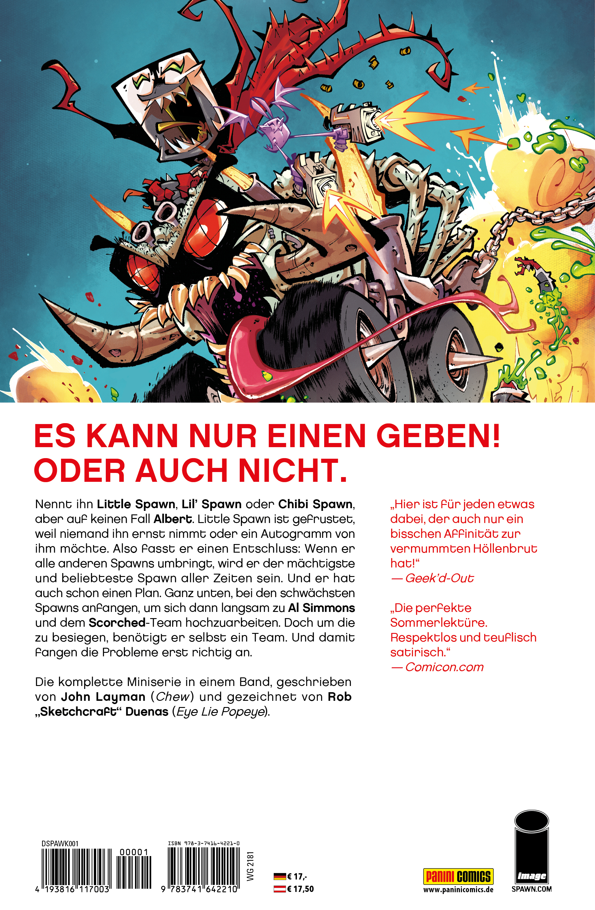 ES KANN NUR EINEN GEBEN! ODER AUCH NICHT. Nennt ihn Little Spawn, Lil' Spawn oder Chibi Spawn, aber auf keinen Fall Albert. Little Spawn ist gefrustet, weil niemand ihn ernst nimmt oder ein Autogramm von ihm möchte. Also fasst er einen Entschluss: Wenn er alle anderen Spawns umbringt, wird er der mächtigste und beliebteste Spawn aller Zeiten sein. Und er hat auch schon einen Plan. Ganz unten, bei den schwächsten Spawns anfangen, um sich dann langsam zu Al Simmons und dem Scorched-Team hochzuarbeiten. Doch um die zu besiegen, benötigt er selbst ein Team. Und damit fangen die Probleme erst richtig an. Die komplette Miniserie in einem Band, geschrieben von John Layman (Chew) und gezeichnet von Rob "Sketchcraft" Duenas (Eye Lie Popeye).