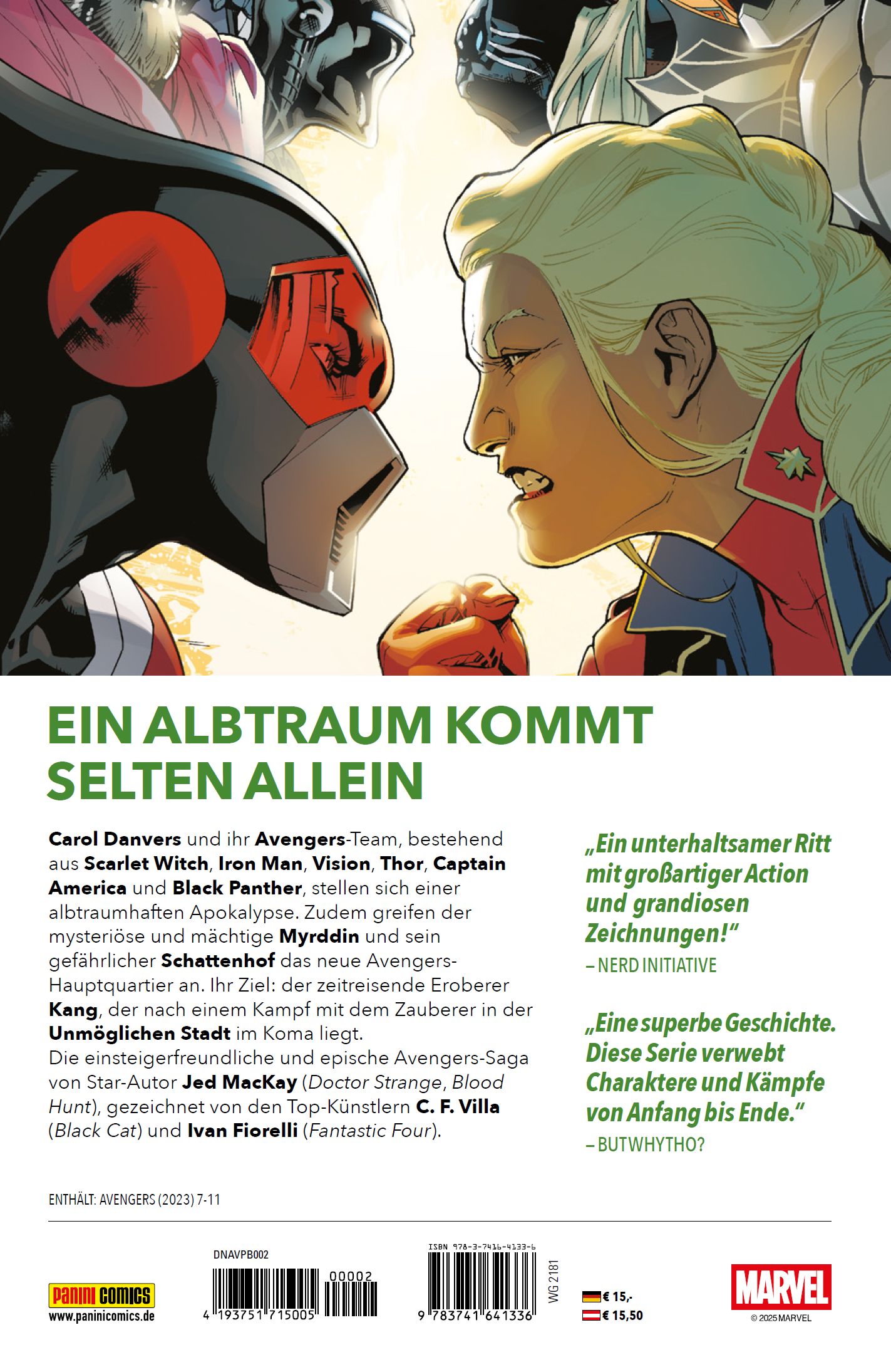 EIN ALBTRAUM KOMMT SELTEN ALLEIN Carol Danvers und ihr Avengers-Team, bestehend aus Scarlet Witch, Iron Man, Vision, Thor, Captain America und Black Panther, stellen sich einer albtraumhaften Apokalypse. Zudem greifen der mysteriöse und mächtige Myrddin und sein gefährlicher Schattenhof das neue Avengers- Hauptquartier an. Ihr Ziel: der zeitreisende Eroberer Kang, der nach einem Kampf mit dem Zauberer in der Unmöglichen Stadt im Koma liegt. Die einsteigerfreundliche und epische Avengers-Saga von Star-Autor Jed MacKay (Doctor Strange, Blood Hunt), gezeichnet von den Top-Künstlern C. F. Villa (Black Cat) und Ivan Fiorelli (Fantastic Four). ENTHÄLT: AVENGERS (2023) 7-11