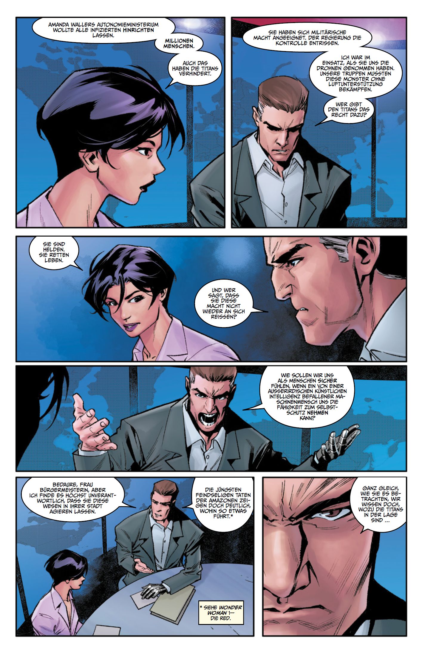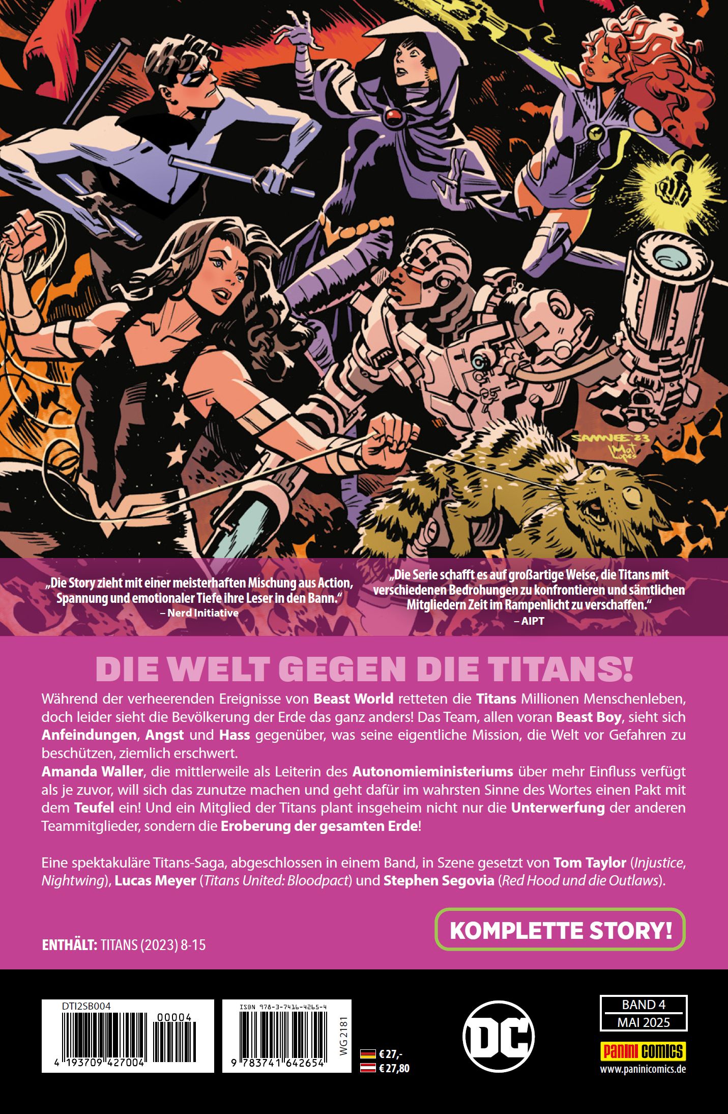 DIE WELT GEGEN DIE TITANS!Während der verheerenden Ereignisse von Beast World retteten die Titans Millionen Menschenleben, doch leider sieht die Bevölkerung der Erde das ganz anders! Das Team, allen voran Beast Boy, sieht sich Anfeindungen, Angst und Hass gegenüber, was seine eigentliche Mission, die Welt vor Gefahren zu beschützen, ziemlich erschwert.Amanda Waller, die mittlerweile als Leiterin des Autonomieministeriums über mehr Einfluss verfügt als je zuvor, will sich das zunutze machen und geht dafür im wahrsten Sinne des Wortes einen Pakt mit dem Teufel ein! Und ein Mitglied der Titans plant insgeheim nicht nur die Unterwerfung der anderen Teammitglieder, sondern die Eroberung der gesamten Erde!Eine spektakuläre Titans-Saga, abgeschlossen in einem Band, in Szene gesetzt von Tom Taylor (Injustice, Nightwing), Lucas Meyer (Titans United: Bloodpact) und Stephen Segovia (Red Hood und die Outlaws).ENTHÄLT: TITANS (2023) 8-15KOMPLETTE STORY!