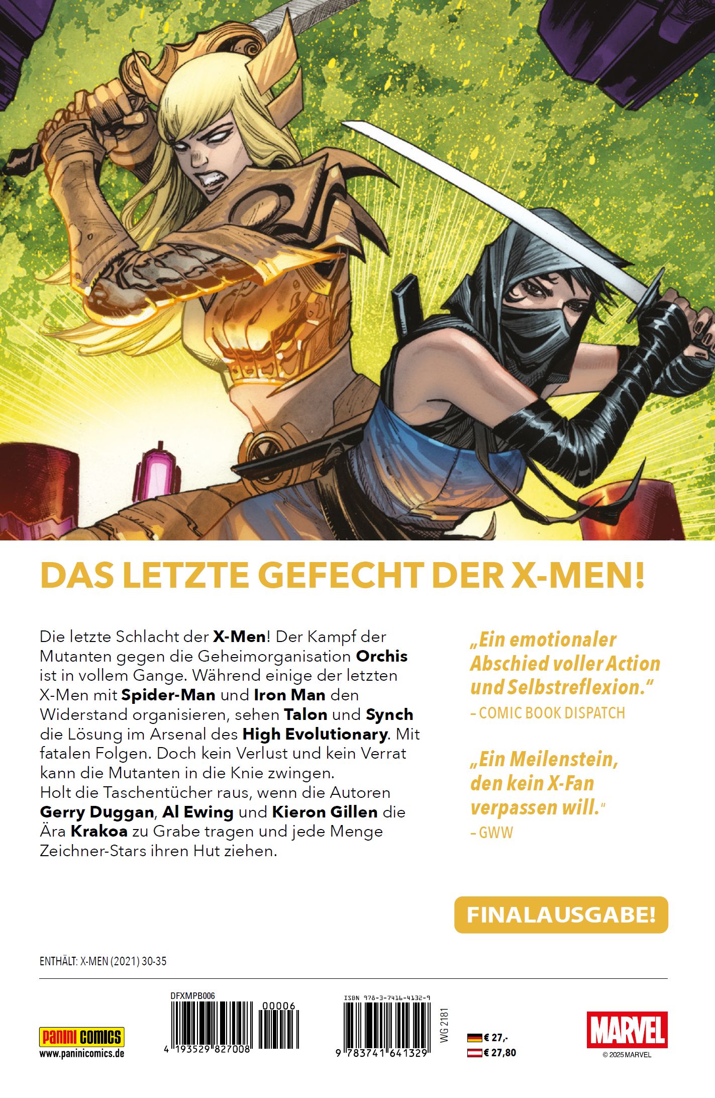 DAS LETZTE GEFECHT DER X-MEN!Die letzte Schlacht der X-Men! Der Kampf der Mutanten gegen die Geheimorganisation Orchis ist in vollem Gange. Während einige der letzten X-Men mit Spider-Man und Iron Man den Widerstand organisieren, sehen Talon und Synch die Lösung im Arsenal des High Evolutionary. Mit fatalen Folgen. Doch kein Verlust und kein Verrat kann die Mutanten in die Knie zwingen. Holt die Taschentücher raus, wenn die Autoren Gerry Duggan, Al Ewing und Kieron Gillen die Ära Krakoa zu Grabe tragen und jede Menge Zeichner-Stars ihren Hut ziehen.ENTHÄLT: X-MEN (2021) 30-35FINALAUSGABE!