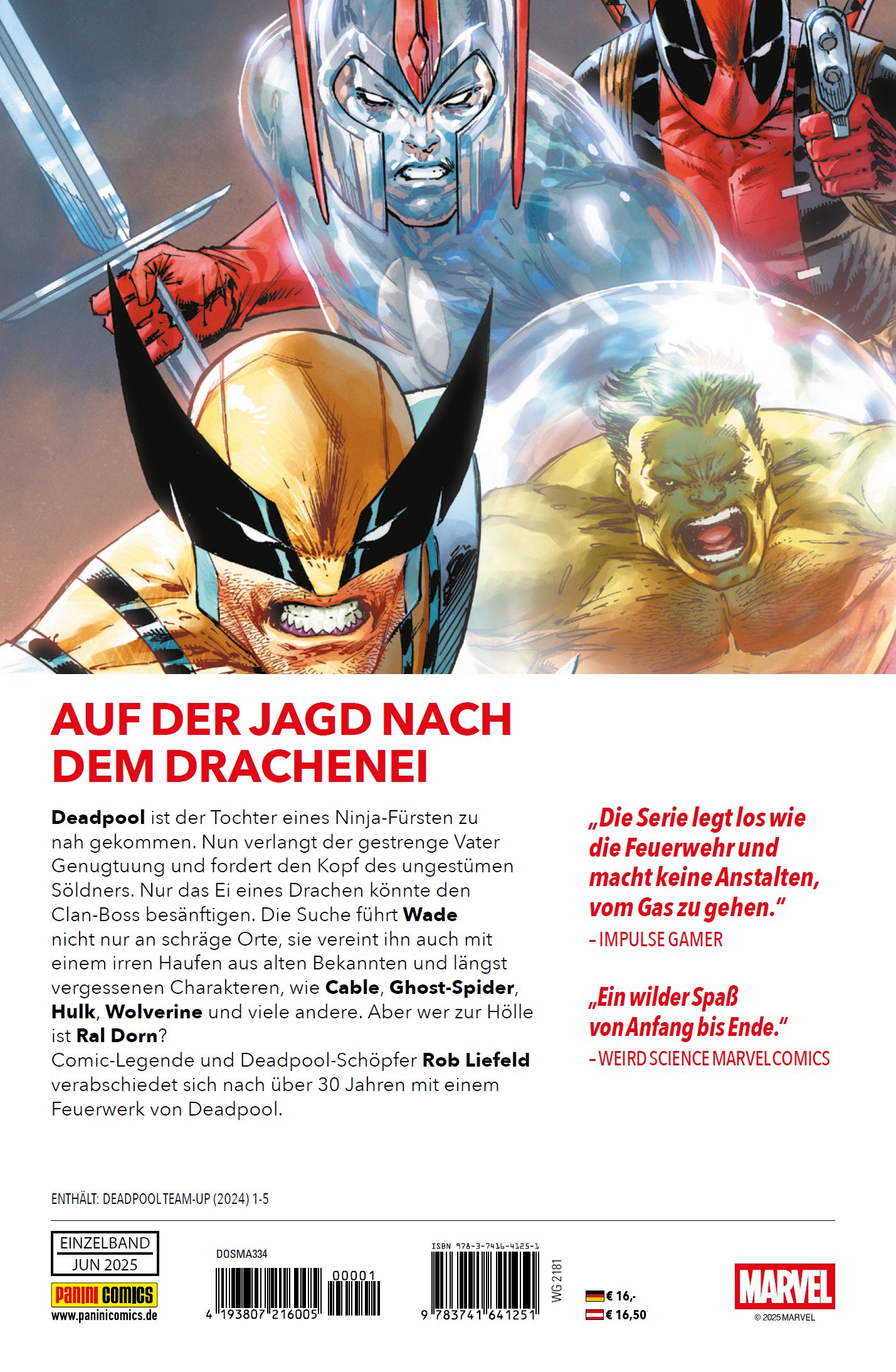 AUF DER JAGD NACH DEM DRACHENEI Deadpool ist der Tochter eines Ninja-Fürsten zu nah gekommen. Nun verlangt der gestrenge Vater Genugtuung und fordert den Kopf des ungestümen Söldners. Nur das Ei eines Drachen könnte den Clan-Boss besänftigen. Die Suche führt Wade nicht nur an schräge Orte, sie vereint ihn auch mit einem irren Haufen aus alten Bekannten und längst vergessenen Charakteren, wie Cable, Ghost-Spider, Hulk, Wolverine und viele andere. Aber wer zur Hölle ist Ral Dorn? Comic-Legende und Deadpool-Schöpfer Rob Liefeld verabschiedet sich nach über 30 Jahren mit einem Feuerwerk von Deadpool.ENTHÄLT: DEADPOOL TEAM-UP (2024) 1-5