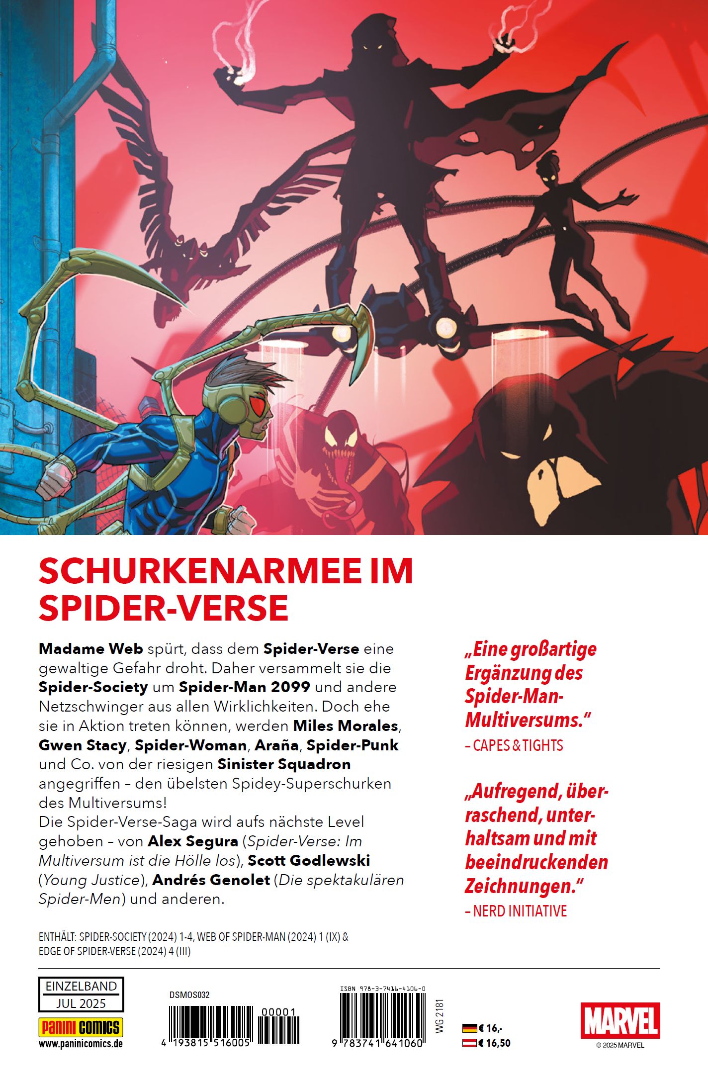 SCHURKENARMEE IM SPIDER-VERSE Madame Web spürt, dass dem Spider-Verse eine gewaltige Gefahr droht. Daher versammelt sie die Spider-Society um Spider-Man 2099 und andere Netzschwinger aus allen Wirklichkeiten. Doch ehe sie in Aktion treten können, werden Miles Morales, Gwen Stacy, Spider-Woman, Araña, Spider-Punk und Co. von der riesigen Sinister Squadron angegriffen - den übelsten Spidey-Superschurken des Multiversums! Die Spider-Verse-Saga wird aufs nächste Level gehoben - von Alex Segura (Spider-Verse: Im Multiversum ist die Hölle los), Scott Godlewski (Young Justice), Andrés Genolet (Die spektakulären Spider-Men) und anderen. ENTHÄLT: SPIDER-SOCIETY (2024) 1-4, WEB OF SPIDER-MAN (2024) 1 (IX) & EDGE OF SPIDER-VERSE (2024) 4 (III)