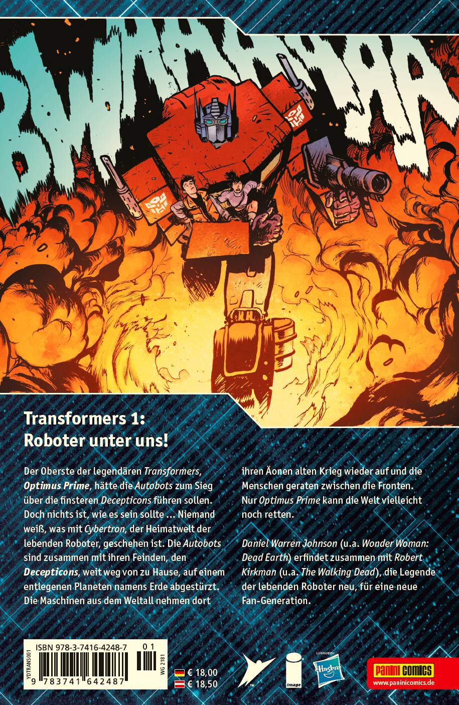 Transformers 1: Roboter unter uns! Der Oberste der legendären Transformers, Optimus Prime, hätte die Autobots zum Sieg über die finsteren Decepticons führen sollen. Doch nichts ist, wie es sein sollte ... Niemand weiß, was mit Cybertron, der Heimatwelt der lebenden Roboter, geschehen ist. Die Autobots sind zusammen mit ihren Feinden, den Decepticons, weit weg von zu Hause, auf einem entlegenen Planeten namens Erde abgestürzt. Die Maschinen aus dem Weltall nehmen dort ihren Äonen alten Krieg wieder auf und die Menschen geraten zwischen die Fronten. Nur Optimus Prime kann die Welt vielleicht noch retten. Daniel Warren Johnson (u.a. Wonder Woman: Dead Earth) erfindet zusammen mit Robert Kirkman (u.a. The Walking Dead), die Legende der lebenden Roboter neu, für eine neue Fan-Generation.