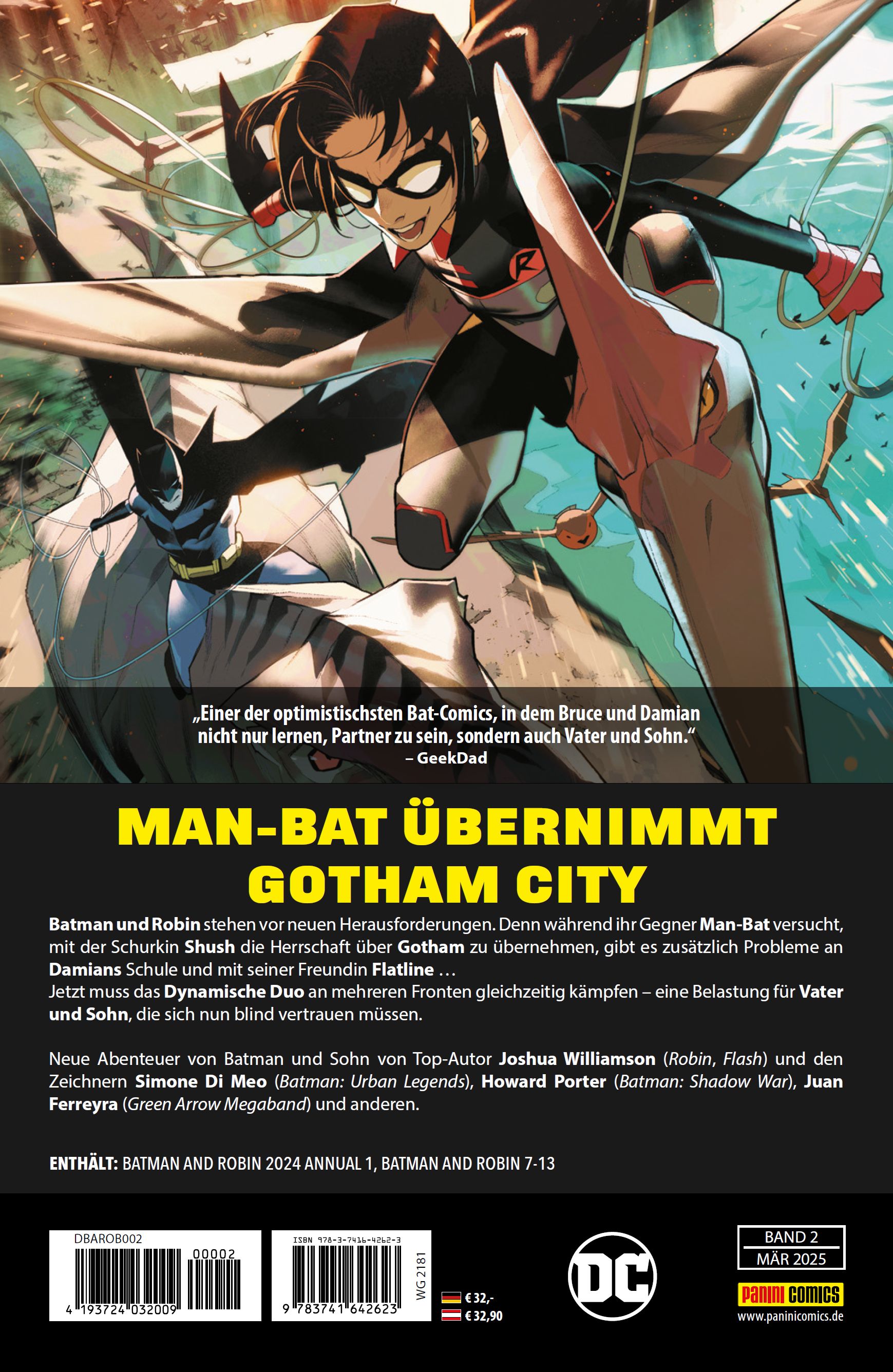 MAN-BAT ÜBERNIMMT GOTHAM CITYBatman und Robin stehen vor neuen Herausforderungen. Denn während ihr Gegner Man-Bat versucht, mit der Schurkin Shush die Herrschaft über Gotham zu übernehmen, gibt es zusätzlich Probleme an Damians Schule und mit seiner Freundin Flatline ...Jetzt muss das Dynamische Duo an mehreren Fronten gleichzeitig kämpfen - eine Belastung für Vater und Sohn, die sich nun blind vertrauen müssen.Neue Abenteuer von Batman und Sohn von Top-Autor Joshua Williamson (Robin, Flash) und den Zeichnern Simone Di Meo (Batman: Urban Legends), Howard Porter (Batman: Shadow War), Juan Ferreyra (Green Arrow Megaband) und anderen.ENTHÄLT: BATMAN AND ROBIN 2024 ANNUAL 1, BATMAN AND ROBIN 7-13