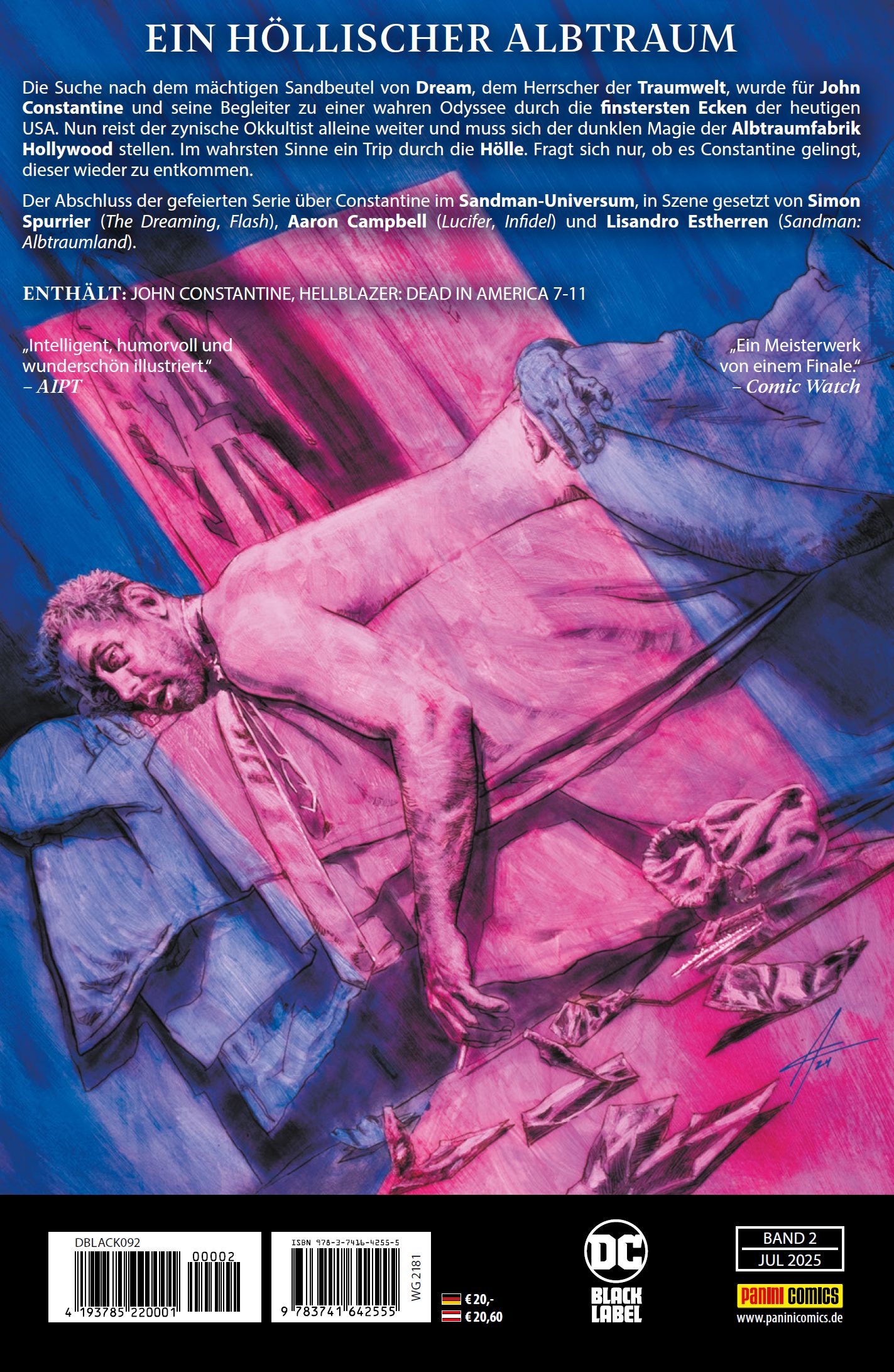 EIN HÖLLISCHER ALBTRAUMDie Suche nach dem mächtigen Sandbeutel von Dream, dem Herrscher der Traumwelt, wurde für John Constantine und seine Begleiter zu einer wahren Odyssee durch die finstersten Ecken der heutigen USA. Nun reist der zynische Okkultist alleine weiter und muss sich der dunklen Magie der Albtraumfabrik Hollywood stellen. Im wahrsten Sinne ein Trip durch die Hölle. Fragt sich nur, ob es Constantine gelingt, dieser wieder zu entkommen.Der Abschluss der gefeierten Serie über Constantine im Sandman-Universum, in Szene gesetzt von Simon Spurrier (The Dreaming, Flash), Aaron Campbell (Lucifer, Infidel) und Lisandro Estherren (Sandman: Albtraumland).ENTHÄLT: JOHN CONSTANTINE, HELLBLAZER: DEAD IN AMERICA 7-11