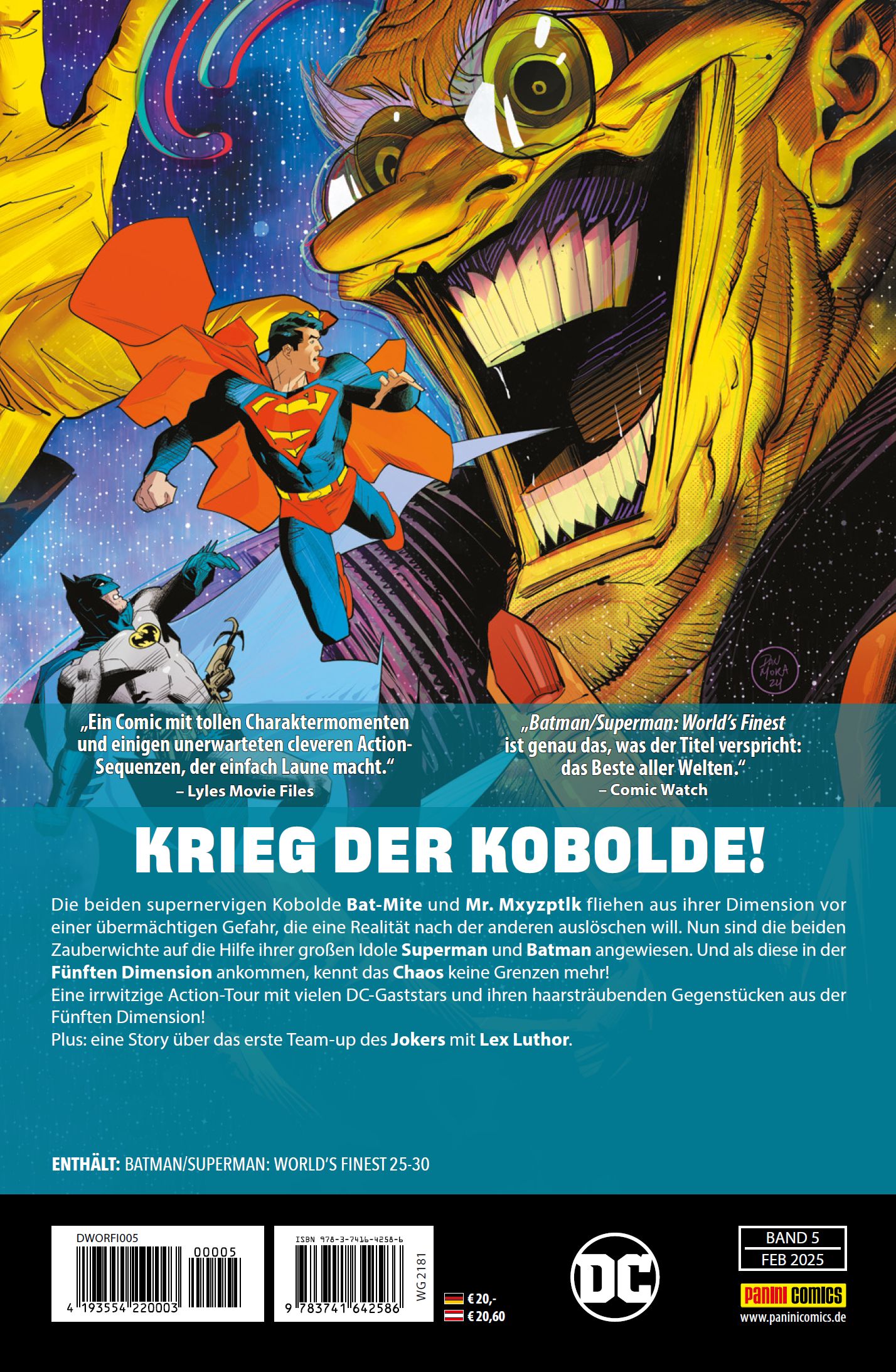 KRIEG DER KOBOLDE!Die beiden supernervigen Kobolde Bat-Mite und Mr. Mxyzptlk fliehen aus ihrer Dimension vor einer übermächtigen Gefahr, die eine Realität nach der anderen auslöschen will. Jetzt sind die beiden Zauberwichte auf die Hilfe ihrer großen Idole Superman und Batman angewiesen. Und als diese in der 5. Dimension ankommen, kennt das Chaos keine Grenzen mehr! Eine irrwitzige Action-Tour mit vielen DC-Gaststars und ihren haarsträubenden Gegenstücken aus der 5. Dimension!Plus: eine Story über das erste Team-Up des Jokers mit Lex Luthor.ENTHÄLT: BATMAN/SUPERMAN: WORLD'S FINEST 25-30