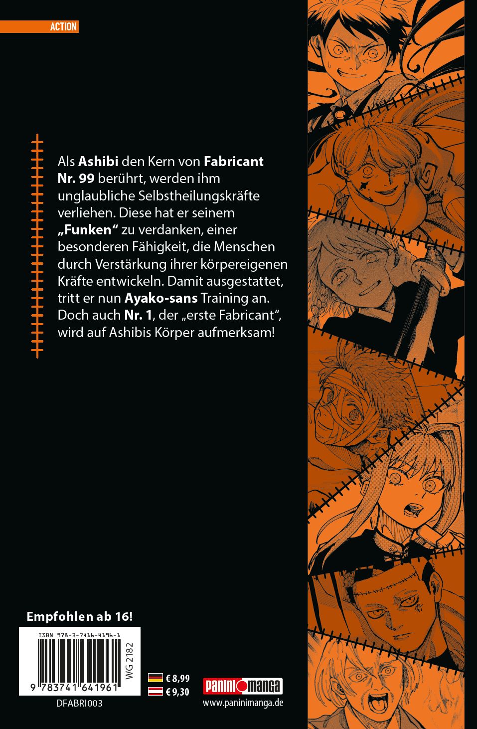 Es war einmal ein Arzt, der darauf fixiert war, den "idealen Menschen" zu erschaffen. Nach dem Tod des Arztes beginnen seine Fabricant-Kreationen, Menschen anzugreifen, um den perfekten Körper zu erlangen. Als Ashibi Yaos gesamte Familie von diesen Fabricants ermordet wird, begibt er sich auf einen Rachefeldzug, begleitet von der letzten Schöpfung des Doktors: Fabricant 100. Das erwartet dich in Band 3: Als Ashibi den Kern von Fabricant Nr. 99 berührt, werden ihm unglaubliche Selbstheilungskräfte verliehen. Diese hat er seinem "Funken" zu verdanken, einer besonderen Fähigkeit, die Menschen durch Verstärkung ihrer körpereigenen Kräfte entwickeln. Damit ausgestattet, tritt er nun Ayako-sans Training an. Doch auch Nr. 1, der "erste Fabricant", wird auf Ashibis Körper aufmerksam!Für Fans von Action-, Abenteuer- und Mysterymanga!