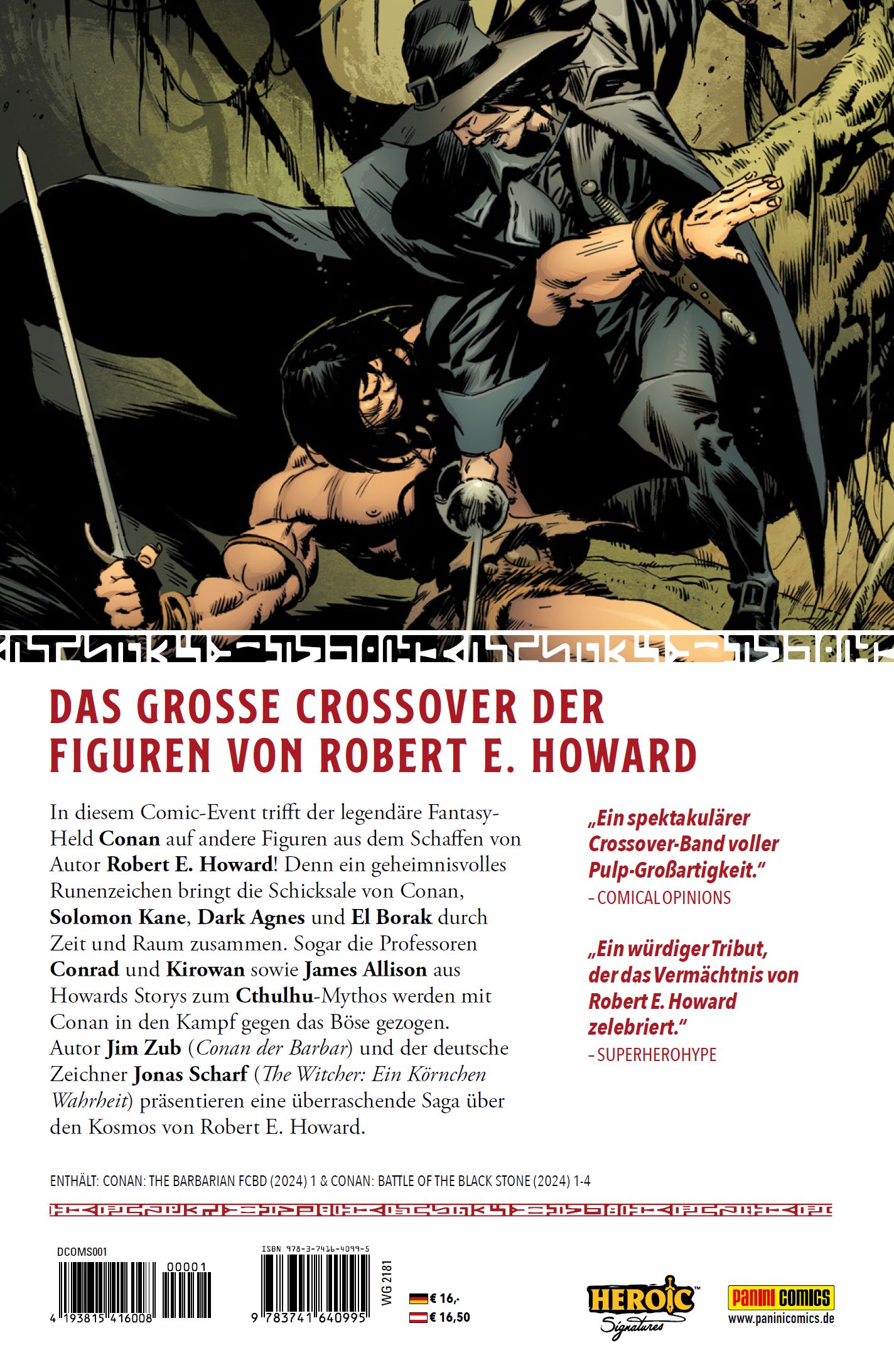 DAS GROSSE CROSSOVER DER FIGUREN VON ROBERT E. HOWARD In diesem Comic-Event trifft der legendäre Fantasy- Held Conan auf andere Figuren aus dem Schaffen von Autor Robert E. Howard! Denn ein geheimnisvolles Runenzeichen bringt die Schicksale von Conan, Solomon Kane, Dark Agnes und El Borak durch Zeit und Raum zusammen. Sogar die Professoren Conrad und Kirowan sowie James Allison aus Howards Storys zum Cthulhu-Mythos werden mit Conan in den Kampf gegen das Böse gezogen. Autor Jim Zub (Conan der Barbar) und der deutsche Zeichner Jonas Scharf (The Witcher: Ein Körnchen Wahrheit) präsentieren eine überraschende Saga über den Kosmos von Robert E. Howard.ENTHÄLT: CONAN: THE BARBARIAN FCBD (2024) 1 & CONAN: BATTLE OF THE BLACK STONE (2024) 1-4