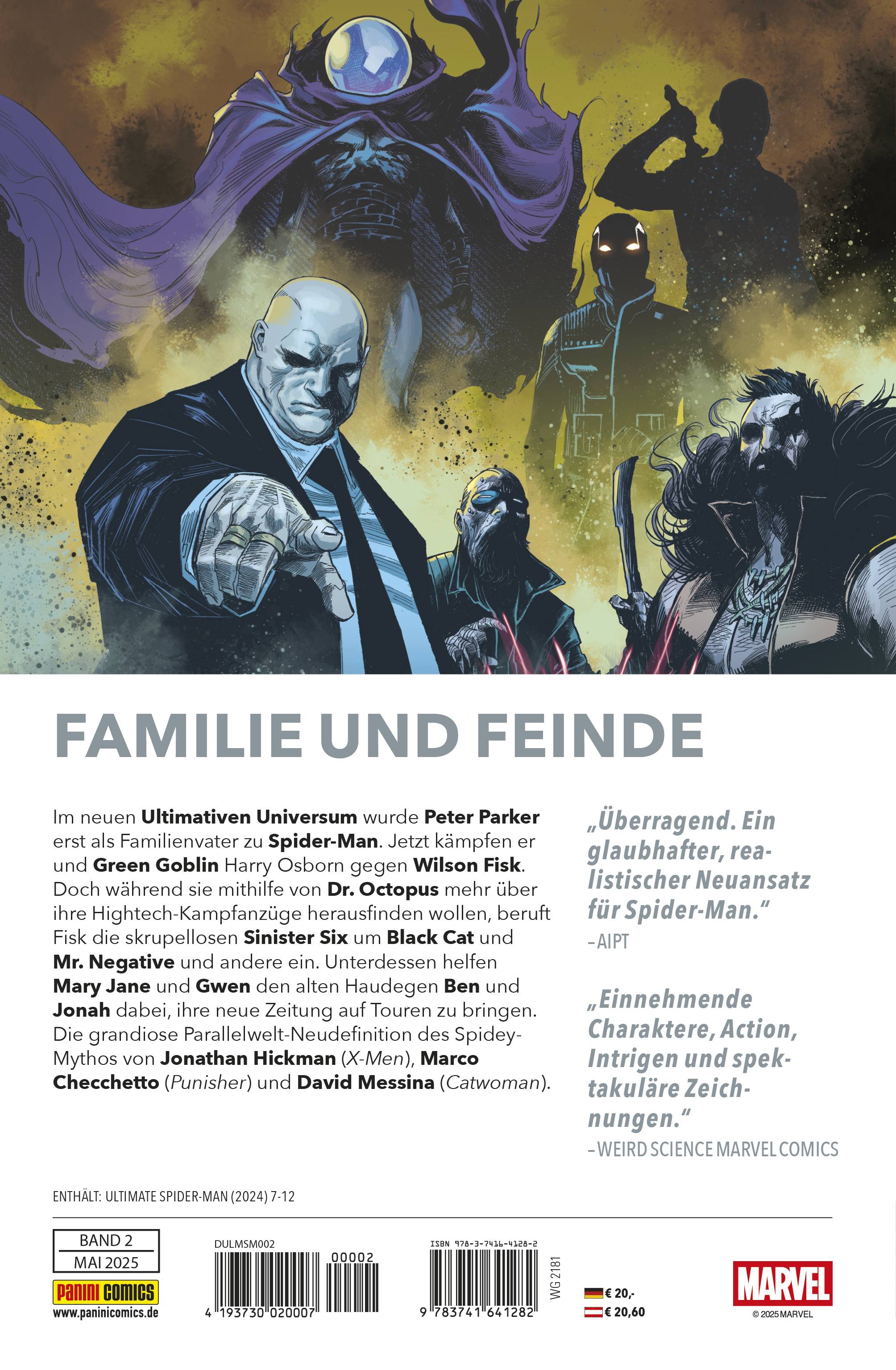 FAMILIE UND FEINDEIm neuen Ultimativen Universum wurde Peter Parker erst als Familienvater zu Spider-Man. Jetzt kämpfen er und Green Goblin Harry Osborn gegen Wilson Fisk. Doch während sie mithilfe von Dr. Octopus mehr über ihre Hightech-Kampfanzüge herausfinden wollen, beruft Fisk die skrupellosen Sinister Six um Black Cat und Mr. Negative und andere ein. Unterdessen helfen Mary Jane und Gwen den alten Haudegen Ben und Jonah dabei, ihre neue Zeitung auf Touren zu bringen. Die grandiose Parallelwelt-Neudefinition des Spidey-Mythos von Jonathan Hickman (X-Men), Marco Checchetto (Punisher) und David Messina (Catwoman). ENTHÄLT: ULTIMATE SPIDER-MAN (2024) 7-12