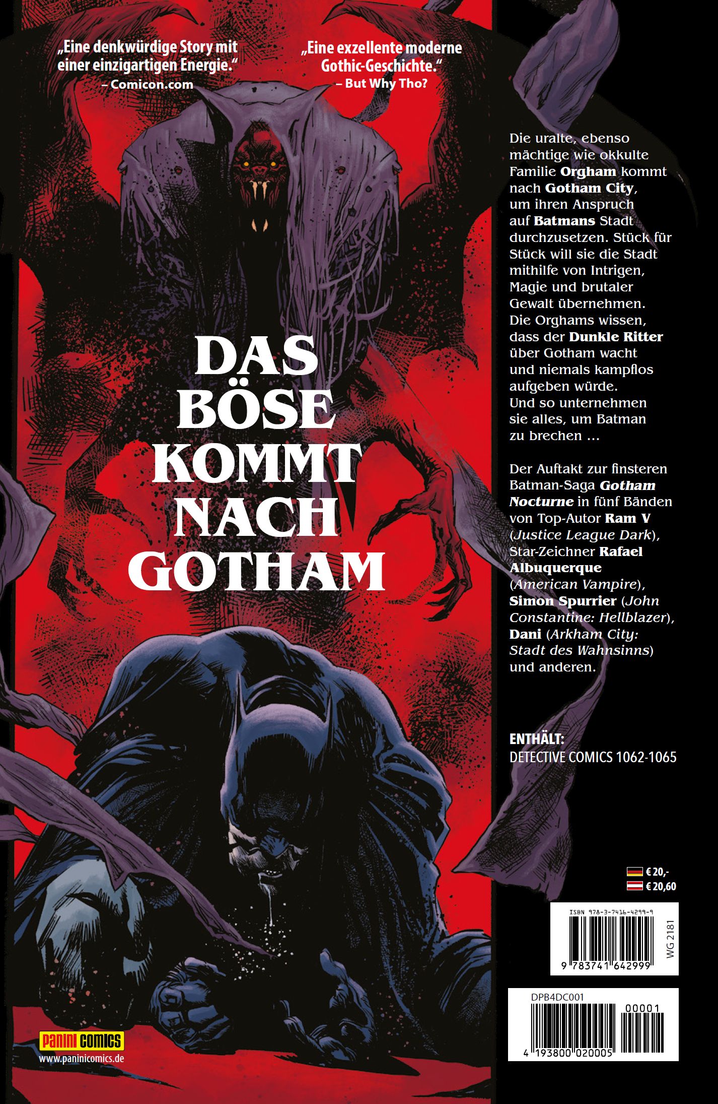 DAS BÖSE KOMMT NACH GOTHAM Die uralte, ebenso mächtige wie okkulte Familie Orgham kommt nach Gotham City, um ihren Anspruch auf Batmans Stadt durchzusetzen. Stück für Stück will sie die Stadt mithilfe von Intrigen, Magie und brutaler Gewalt übernehmen. Die Orghams wissen, dass der Dunkle Ritter über Gotham wacht und niemals kampflos aufgeben würde. Und so unternehmen sie alles, um Batman zu brechen ... Der Auftakt zur finsteren Batman-Saga Gotham Nocturne in fünf Bänden von Top-Autor Ram V (Justice League Dark), Star-Zeichner Rafael Albuquerque (American Vampire), Simon Spurrier (John Constantine: Hellblazer), Dani (Arkham City: Stadt des Wahnsinns) und anderen. ENTHÄLT: DETECTIVE COMICS 1062-1065