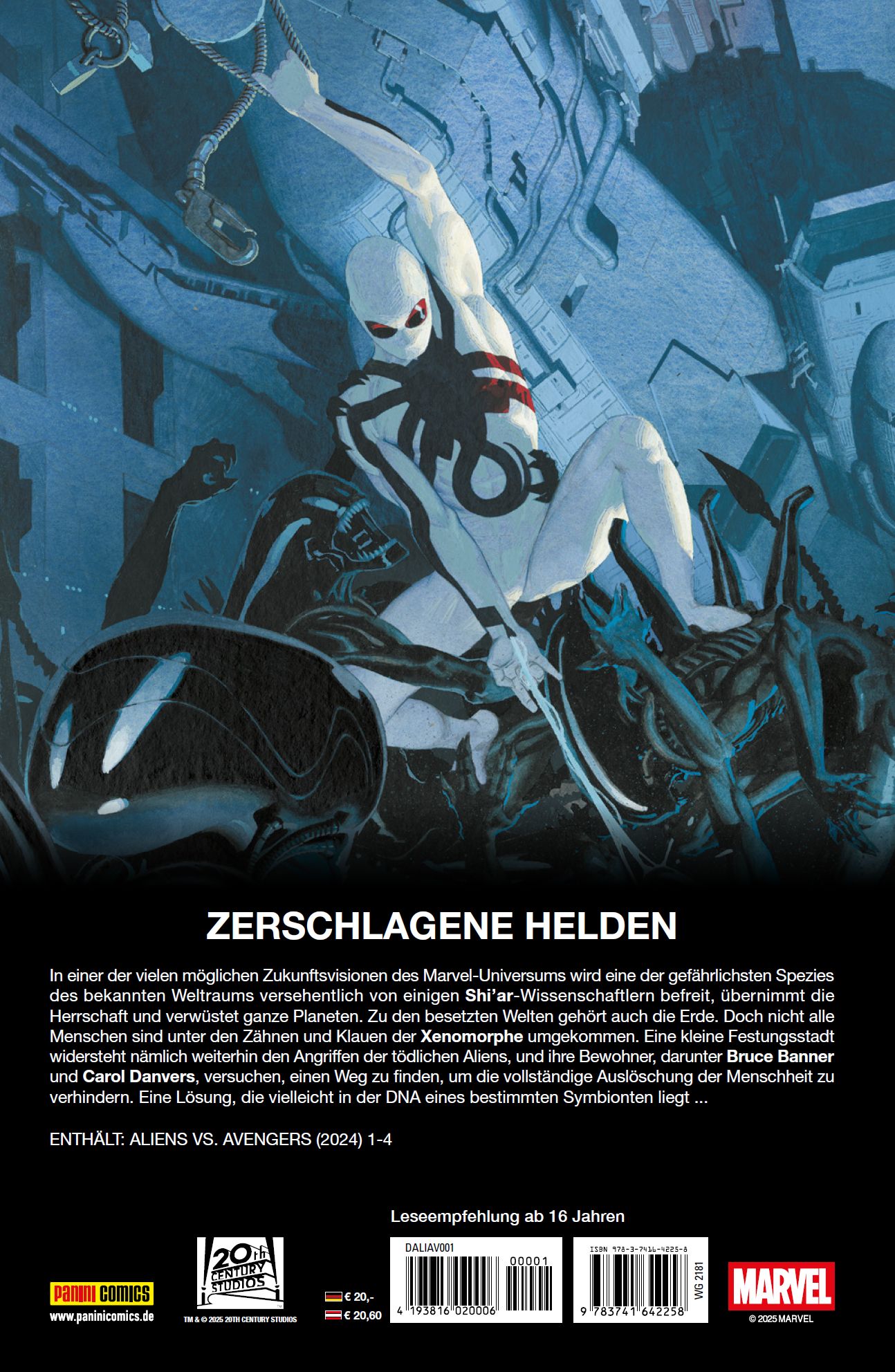 ZERSCHLAGENE HELDEN In einer der vielen möglichen Zukunftsvisionen des Marvel-Universums wird eine der gefährlichsten Spezies des bekannten Weltraums versehentlich von einigen Shi'ar-Wissenschaftlern befreit, übernimmt die Herrschaft und verwüstet ganze Planeten. Zu den besetzten Welten gehört auch die Erde. Doch nicht alle Menschen sind unter den Zähnen und Klauen der Xenomorphe umgekommen. Eine kleine Festungsstadt widersteht nämlich weiterhin den Angriffen der tödlichen Aliens, und ihre Bewohner, darunter Bruce Banner und Carol Danvers, versuchen, einen Weg zu finden, um die vollständige Auslöschung der Menschheit zu verhindern. Eine Lösung, die vielleicht in der DNA eines bestimmten Symbionten liegt ... ENTHÄLT: ALIENS VS. AVENGERS (2024) 1-4