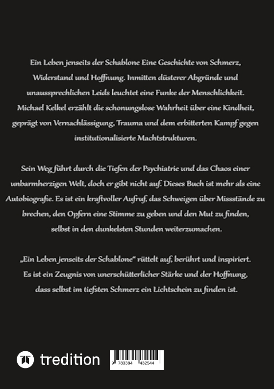 Ein Blick in das Leben von Michael Kelkel, eine Geschichte von Leid und Hoffnung Stell dir vor, du bist in einer Welt gefangen, die dir keine Liebe und keinen Trost bietet. Deine Kindheit ist geprägt von Vernachlässigung, Schmerz und einer tiefen Einsamkeit, die nicht nur in deinen Erinnerungen, sondern auch in deinen Herzen Wunden hinterlässt, die nie ganz heilen. Michael Kelkel weiß genau, wie sich das anfühlt. Er hat in seiner Kindheit mehr Leid erlebt, als viele Menschen in einem ganzen Leben ertragen müssen. Eine Kindheit, in der er nicht nur das Gefühl hatte, nicht willkommen zu sein, sondern auch die schmerzliche Erfahrung machen musste, von denen, die ihn hätte lieben sollen, verlassen zu werden. Die Worte „Fürsorge“ und „Schutz“ waren für ihn Fremdworte, die in den kalten Mauern von Psychiatrien und Heimen keine Bedeutung hatten. Jedes Kapitel seines Lebens war ein Kampf ums Überleben, gegen die Schatten der Vergangenheit, gegen die Mauern der Institutionen, die ihn nie wirklich verstanden haben. In den Psychiatrien, in denen er sich wiederfand, erlebte er Machtmissbrauch, Isolation und einen ständigen inneren Kampf, der ihn mehrmals an den Rand der Verzweiflung brachte. Trotz der vielen Momente, in denen er das Gefühl hatte, am Boden zu sein, fand er immer wieder die Kraft, weiterzumachen. Denn tief in seinem Inneren wusste er, dass es noch einen Funken Hoffnung gab, auch wenn die Dunkelheit alles zu verschlingen schien. Dieses Buch ist seine Geschichte, eine Geschichte, die von den tiefsten Abgründen menschlichen Leids und der unerschütterlichen Entschlossenheit erzählt, trotzdem weiterzugehen. Es ist eine Einladung an dich, mit ihm auf eine Reise zu gehen, die nicht nur von Schmerz und Trauma geprägt ist, sondern auch von der unglaublichen Stärke, die im Überleben steckt. Michael Kelkel öffnet dir in diesem Buch sein Herz und zeigt dir, wie man auch in den dunkelsten Stunden des Lebens wieder einen Funken Hoffnung finden kann. Es ist ein Appell, nicht aufzugeben, niemals. Denn selbst aus den tiefsten Wunden kann etwas Heiles und Schönes wachsen, wenn man den Mut hat, weiterzugehen.