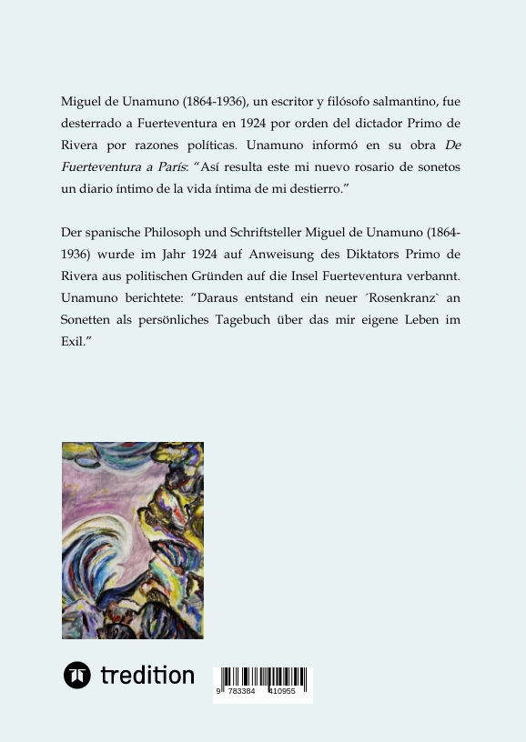 Hier findet sich eine Auswahl an Poemen und Tagebuchauszügen des Schriftstellers Miguel de Unamuno, die aus seinem Werk ´De Fuerteventura a París` stammen. Sie geben Zeugnis von seiner schweren Lebenssituation als Verbannter auf der Kanareninsel Fuerteventura im Jahr 1924, von dem dumpfen und ihn verzehrenden Warten ("Espera tupida") auf ein Ende seiner Gefangenschaft, aber auch von seiner Zugewandtheit zu den auf Fuerteventura lebenden einheimischen Menschen. Er ist fasziniert von der schroffen Wüstenlandschaft des kargen Eilands inmitten einer allmächtigen See und ist sich gleichzeitig bewusst, dass er am Verbannungsort nicht sein weiteres Leben fristen kann. Nach vier Monaten gelingt ihm die Flucht per Schiff und die Weiterreise nach Paris, wo ihm Asyl gewährt wird. Die Schriftstellerin Alissa Carpentier dichtete 18 seiner auf Fuerteventura verfassten Sonette in deutscher Sprache nach, übersetzte die ihnen zugeordneten Exzerpte aus den Tagebüchern und illustrierte den Band mit 34 eigenen Federzeichnungen.