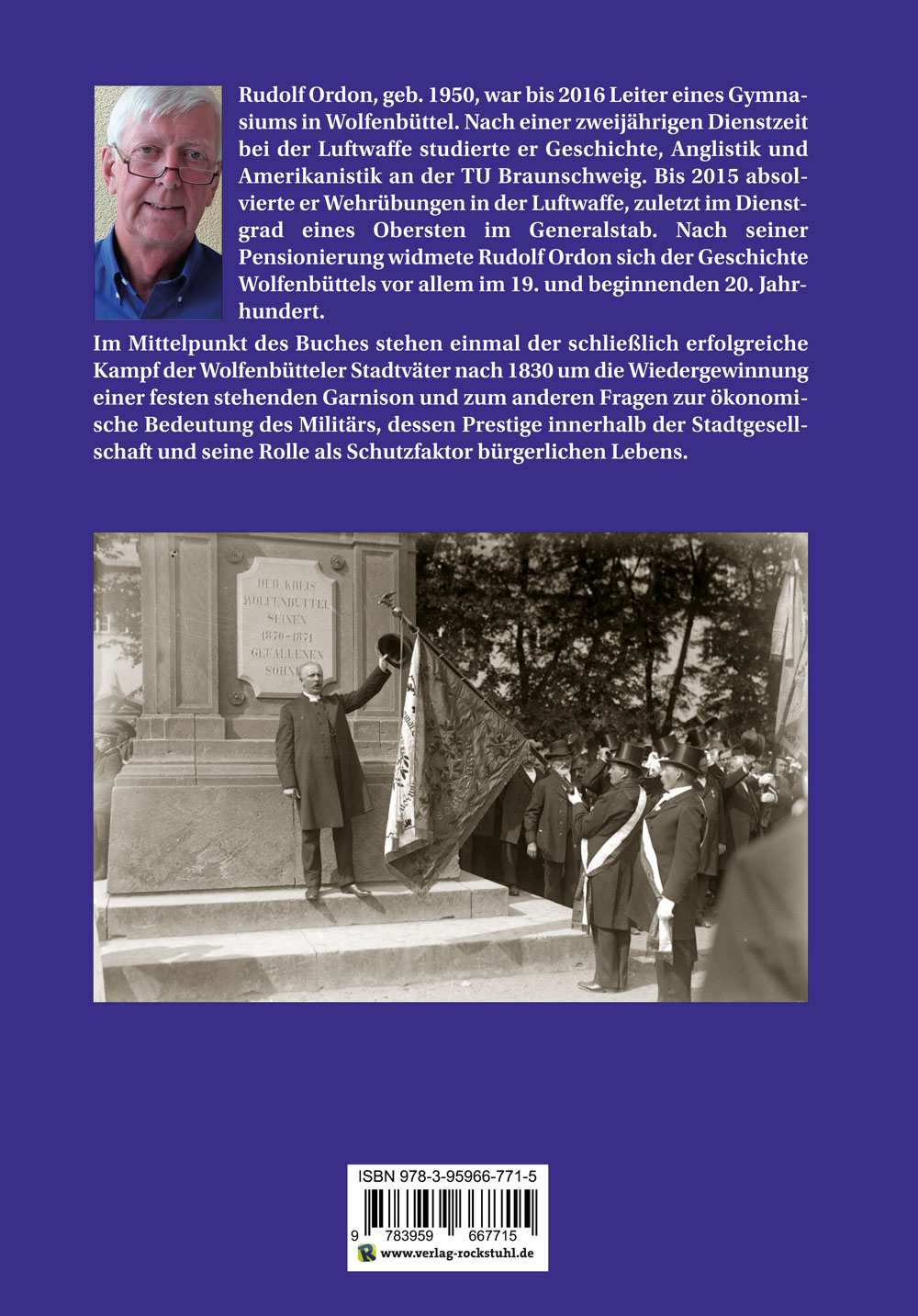Rudolf Ordon, geb. 1950, war bis 2016 Leiter eines Gymnasiums in Wolfenbüttel. Nach einer zweijährigen Dienstzeit bei der Luftwaffe studierte er Geschichte, Anglistik und Amerikanistik an der TU Braunschweig. Bis 2015 absolvierte er Wehrübungen in der Luftwaffe, zuletzt im Dienstgrad eines Obersten im Generalstab. Nach seiner Pensionierung widmete Rudolf Ordon sich der Geschichte Wolfenbüttels vor allem im 19. und beginnenden 20. Jahrhundert.