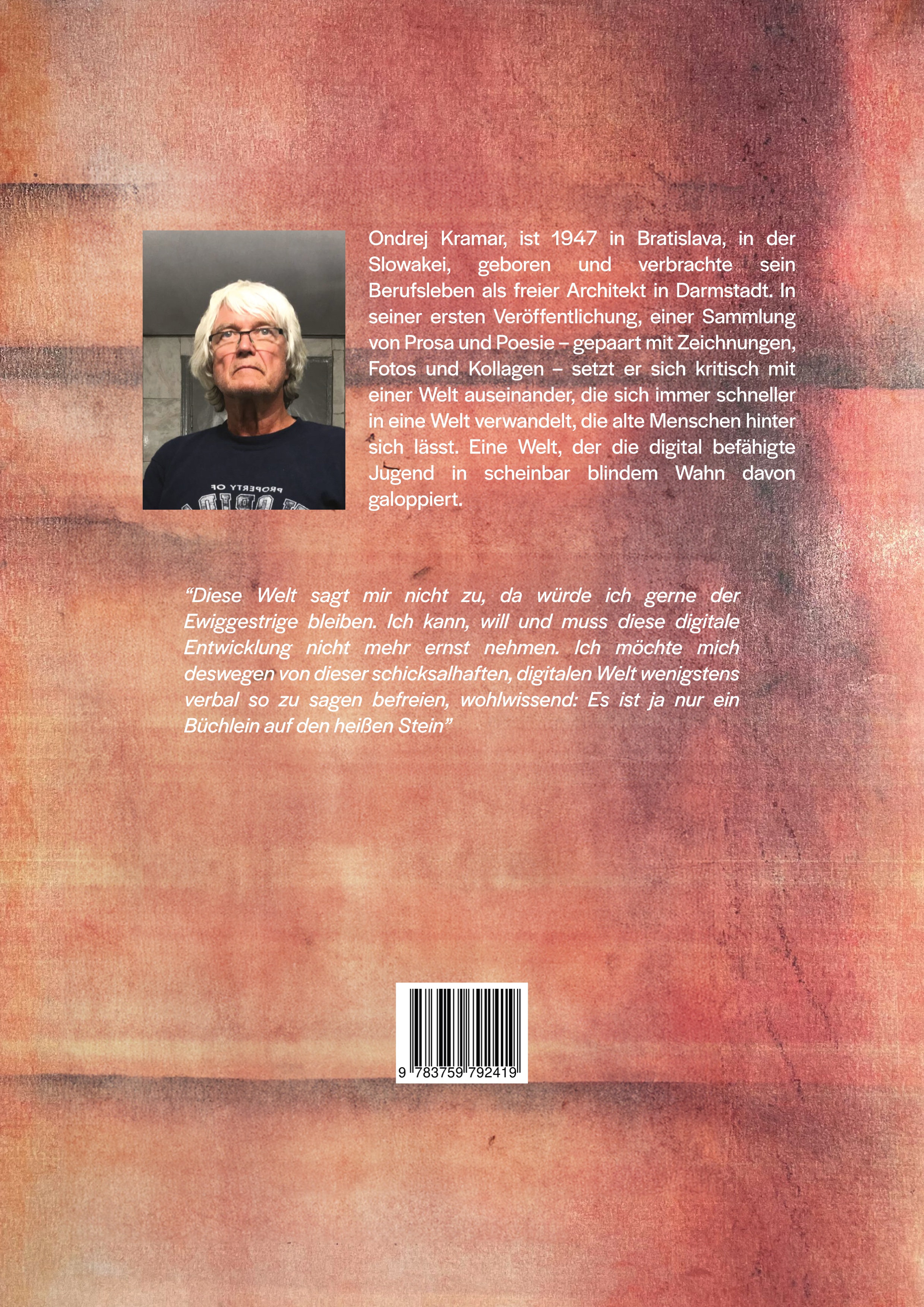 In seiner ersten Veröffentlichung, einer Sammlung von Prosa und Poesie - gepaart mit Zeichnungen, Fotos und Kollagen - setzt er sich kritisch mit einer Welt auseinander, die sich immer schneller in eine Welt verwandelt, die alte Menschen hinter sich lässt. Eine Welt, der die digital befähigte Jugend, in scheinbar blindem Wahn, davon galoppiert.
