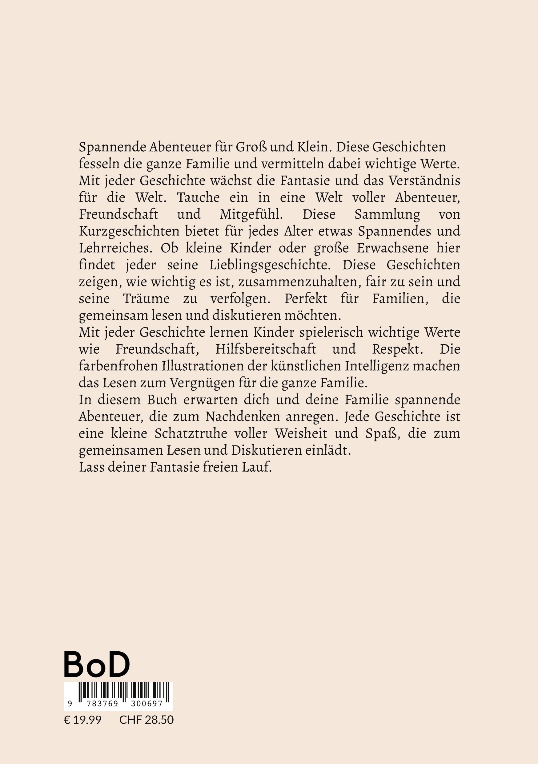 Spannende Abenteuer für Groß und Klein. Diese Geschichten fesseln die ganze Familie und vermitteln dabei wichtige Werte. Mit jeder Geschichte wächst die Fantasie und das Verständnis für die Welt. Tauche ein in eine Welt voller Abenteuer, Freundschaft und Mitgefühl. Diese Sammlung von Kurzgeschichten bietet für jedes Alter etwas Spannendes und Lehrreiches. Ob kleine Kinder oder große Erwachsene hier findet jeder seine Lieblingsgeschichte. Diese Geschichten zeigen, wie wichtig es ist, zusammenzuhalten, fair zu sein und seine Träume zu verfolgen. Perfekt für Familien, die gemeinsam lesen und diskutieren möchten.