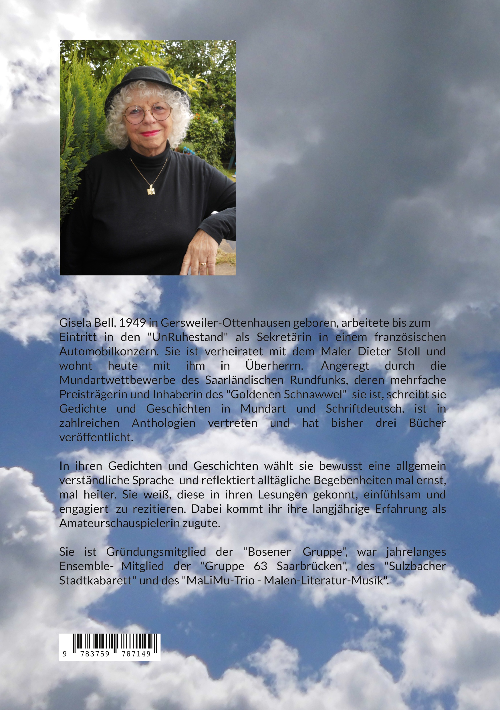 Gisela Bell, 1949 in Gersweiler-Ottenhausen geboren, arbeitete bis zum Eintritt in den "UnRuhestand" als Sekretärin in einem französischen Automobilkonzern. Sie ist verheiratet mit dem Maler Dieter Stoll und wohnt heute mit ihm in Überherrn. Angeregt durch die Mundartwettbewerbe des Saarländischen Rundfunks, deren mehrfache Preisträgerin und Inhaberin des "Goldenen Schnawwel" sie ist, schreibt sie Gedichte und Geschichten in Mundart und Schriftdeutsch, ist in zahlreichen Anthologien vertreten und hat bisher drei Bücher veröffentlicht. In ihren Gedichten und Geschichten wählt sie bewusst eine allgemein verständliche Sprache und reflektiert alltägliche Begebenheiten mal ernst, mal heiter. Sie weiß, diese in ihren Lesungen gekonnt, einfühlsam und engagiert zu rezitieren. Dabei kommt ihr ihre langjährige Erfahrung als Amateurschauspielerin zugute. Sie ist Gründungsmitglied der "Bosener Gruppe", war jahrelanges Ensemble-Mitglied der "Gruppe 63 Saarbrücken", des "Sulzbacher Stadtkabarett" und des "MaLiMu-Trio - Malen-Literatur-Musik".