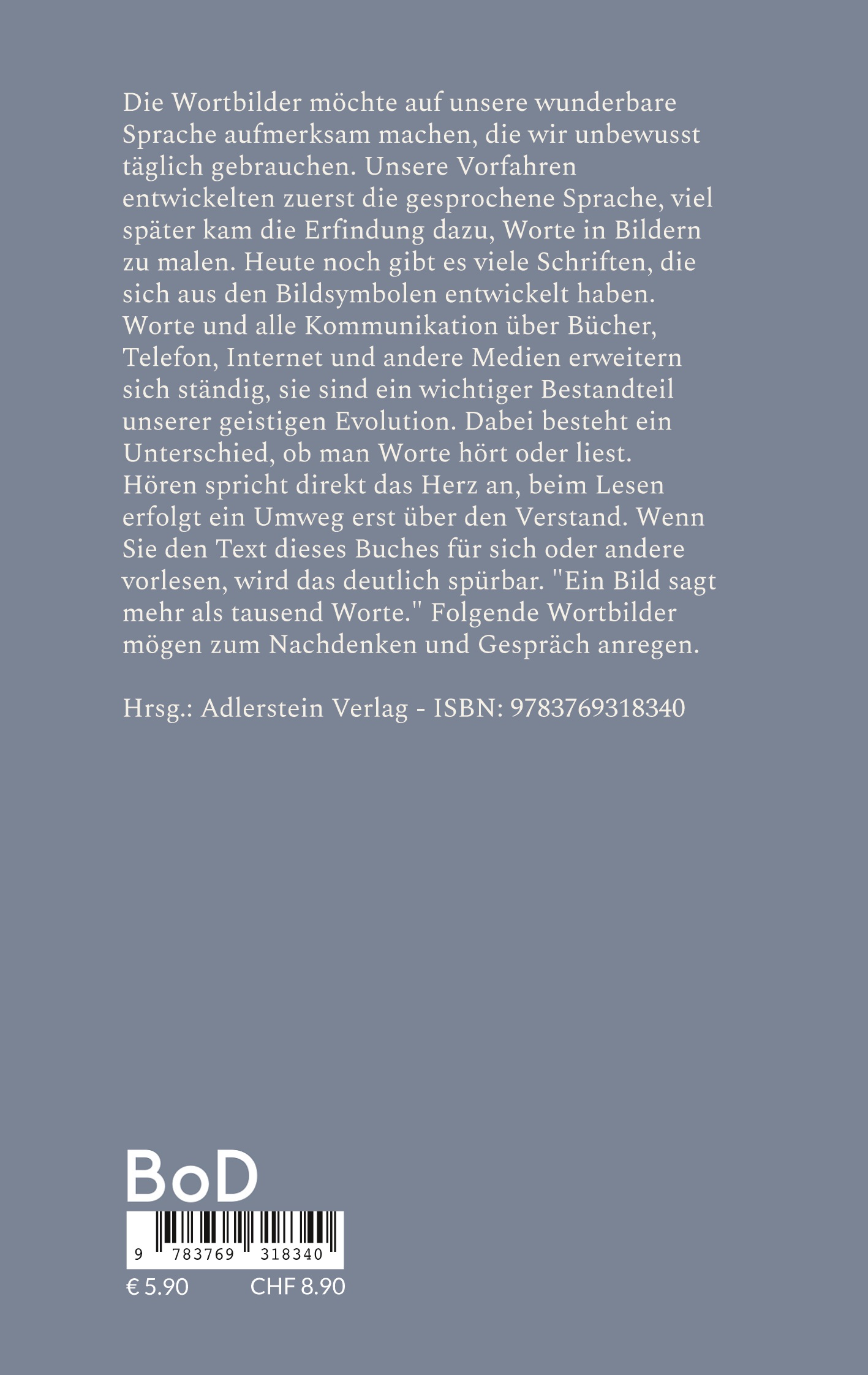 Die Wortbilder möchten auf unsere wunderbare Sprache aufmerksam machen, die wir unbewusst täglich gebrauchen. Unsere Vorfahren entwickelten zuerst die gesprochene Sprache, später kam die Erfindung dazu, Worte in Bildern zu malen. Heute noch gibt es viele Schriften, die sich aus den Bildsymbolen entwickelt haben. Worte und alle Kommunikation über Bücher, Telefon, Internet und andere Medien entwickeln sich ständig weiter, sie sind ein wichtiger Bestandteil unserer geistigen Evolution. Dabei besteht ein Unterschied, ob man Worte hört oder liest. Hören spricht direkt das Herz an, beim Lesen erfolgt der Umweg erst über den Verstand. Wenn Sie den Text dieses Buches für sich oder andere vorlesen, wird das deutlich spürbar. "Ein Bild sagt mehr als tausend Worte". Folgende Wortbilder mögen zum Nachdenken und Gespräch anregen.