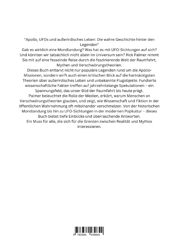 Gab es wirklich eine Mondlandung? Was hat es mit UFO-Sichtungen auf sich? Und könnten wir tatsächlich nicht allein im Universum sein? Rick Palmer nimmt Sie mit auf eine fesselnde Reise durch die faszinierende Welt der Raumfahrt, Mythen und Verschwörungstheorien.Dieses Buch entlarvt nicht nur populäre Legenden rund um die Apollo-Missionen, sondern wirft auch einen kritischen Blick auf die hartnäckigsten Theorien über außerirdisches Leben und unbekannte Flugobjekte. Fundierte wissenschaftliche Fakten treffen auf jahrzehntelange Spekulationen - ein Spannungsfeld, das unser Bild der Raumfahrt bis heute prägt.Palmer beleuchtet die Rolle der Medien, erklärt, warum Menschen an Verschwörungstheorien glauben, und zeigt, wie Wissenschaft und Fiktion in der öffentlichen Wahrnehmung oft miteinander verschmelzen. Von der historischen Mondlandung bis hin zu UFO-Sichtungen in der modernen Popkultur - dieses Buch bietet tiefe Einblicke und überraschende Antworten.Ein Muss für alle, die sich für die Grenzen zwischen Realität und Mythos interessieren.