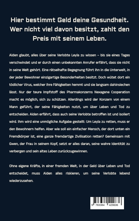 Hier bestimmt Geld deine Gesundheit. Wer nicht viel davon besitzt, zahlt den Preis mit seinem Leben.Aiden glaubt, alles über seine Verlobte Leyla zu wissen - bis sie eines Tages verschwindet und er durch einen unbekannten Anrufer erfährt, dass sie nicht in seine Welt gehört. Eine rätselhafte Begegnung führt ihn in die Unterwelt, in der jeder Bewohner einzigartige Besonderheiten besitzt. Doch wütet dort ein tödlicher Virus, welcher ihre Fähigkeiten hemmt und sie langsam dahinsiechen lässt. Nur der teure Impfstoff des Pharmakonzerns Nexagene Cooperation macht es möglich, sich zu schützen. Allerdings wird der Konzern von einem Mann geführt, der seine Fähigkeiten nutzt, um über Leben und Tod zu entscheiden. Aiden erfährt, dass auch seine Verlobte betroffen ist und isoliert wird. Ihm wird eine unmögliche Aufgabe gestellt: Um Leyla zu retten, muss er den Bewohnern helfen. Aber wie soll ein einfacher Mensch, der dort unten ein Fremdkörper ist, eine ganze fremdartige Zivilisation retten? Gemeinsam mit Gwen, der Frau in seinem Kopf, setzt er alles daran, seine wahre Identität zu verbergen und sein altes Leben zurückzugewinnen.Ohne eigene Kräfte, in einer fremden Welt, in der Geld über Leben und Tod entscheidet, muss Aiden alles riskieren, um seine Verlobte lebend wiederzusehen.