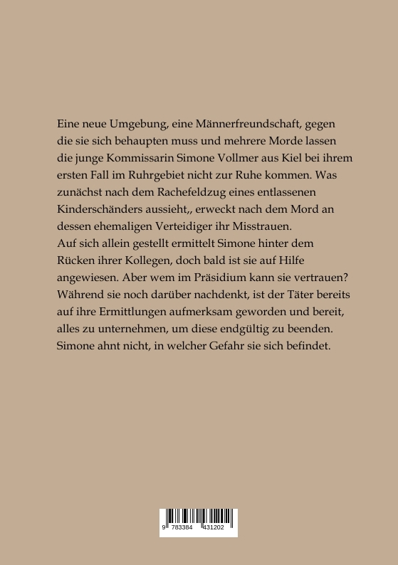 Eine neue Umgebung, eine Männerfreundschaft, gegen die sie sich behaupten muss und mehrere Morde lassen die junge Kommissarin Simone Vollmer aus Kiel bei ihrem ersten Fall im Ruhrgebiet nicht zur Ruhe kommen. Was zunächst nach dem Rachefeldzug eines entlassenen Kinderschänders aussieht, erweckt nach dem Mord an dessen ehemaligen Verteidiger ihr Misstrauen.Auf sich allein gestellt ermittelt Simone hinter dem Rücken ihrer Kollegen, doch bald ist sie auf Hilfe angewiesen. Aber wem kann sie im Präsidium vertrauen?Während sie noch darüber nachdenkt, ist der Täter bereits auf ihre Ermittlungen aufmerksam geworden und bereit, alles zu unternehmen, um diese endgültig zu beenden. Simone ahnt nicht, in welcher Gefahr sie sich befindet.