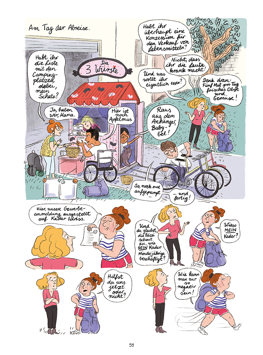 Magali Le Huche hat Clémentine Beauvais’ chaotischen Rad-Roadtrip DIE KÖNIGINNEN DER WÜRSTCHEN (Carlsen Verlag) in einen empowernden Comic verwandelt. Der Jugendroman wurde ausgezeichnet mit dem LUCHS und nominiert für den Buxtehuder Bullen und den Prix des lycéens allemands 2017.